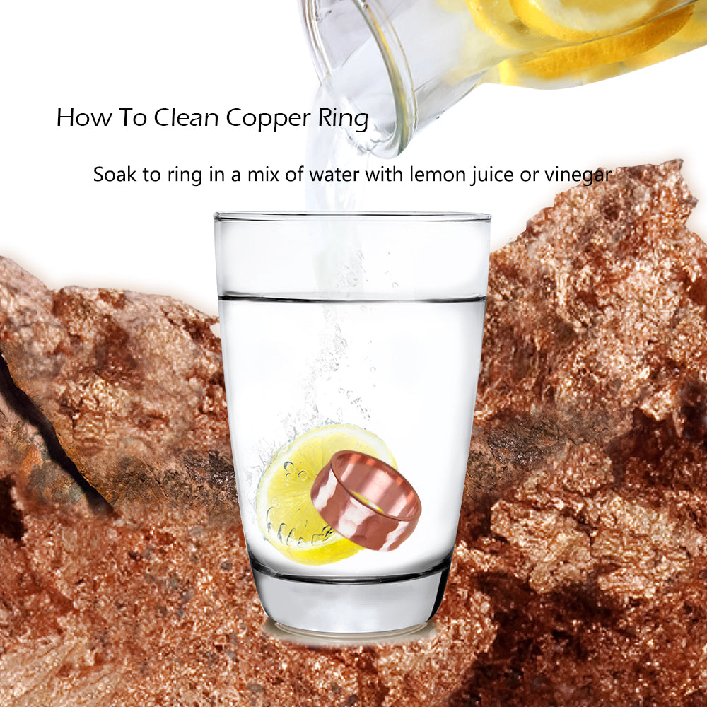 [How to Clean Copper Ring] Copper naturally oxidizes and patinas over time; this is not a defect. In fact, patina adds a beautiful, antique look to the ring. However, a polishing cloth or soaking in lemon juice can be used to clean the ring.