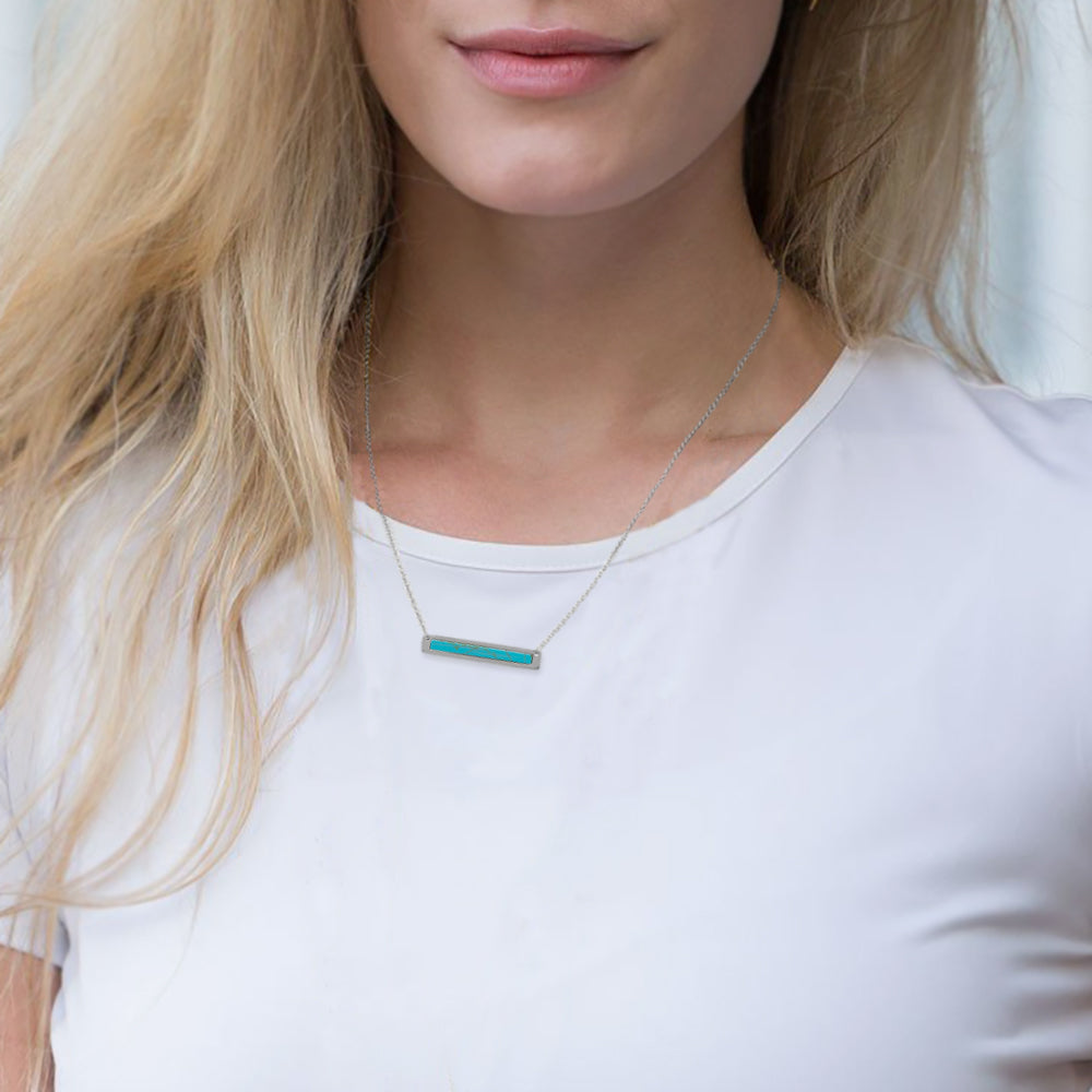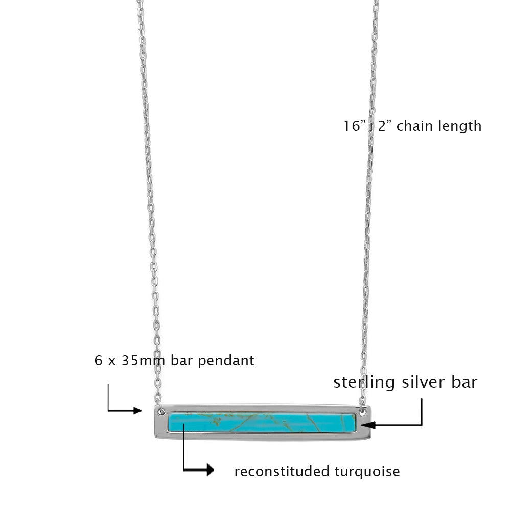 This contemporary design features a inlaid reconstituted turquoise within a sleek silver bar as it hangs gracefully from a classic cable chain. Necklace has a lobster clasp closure. Chain length 16"+2" extension.