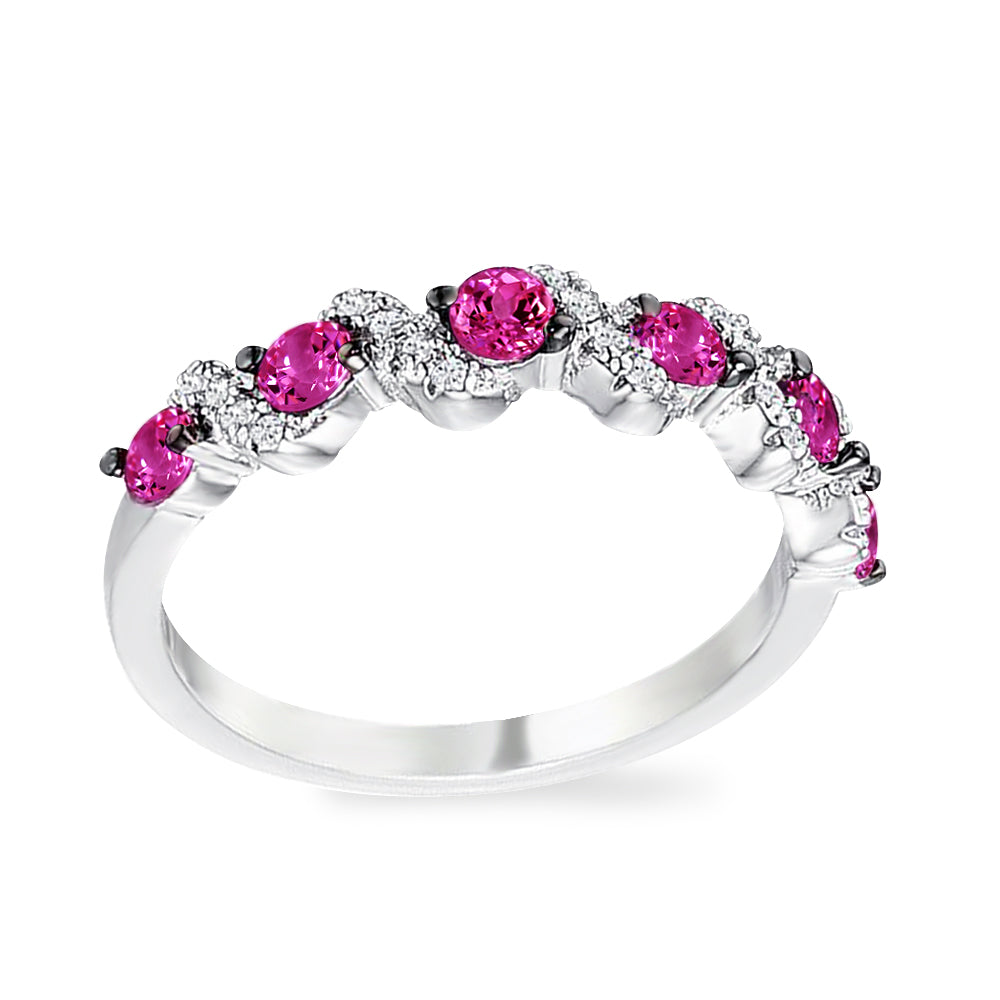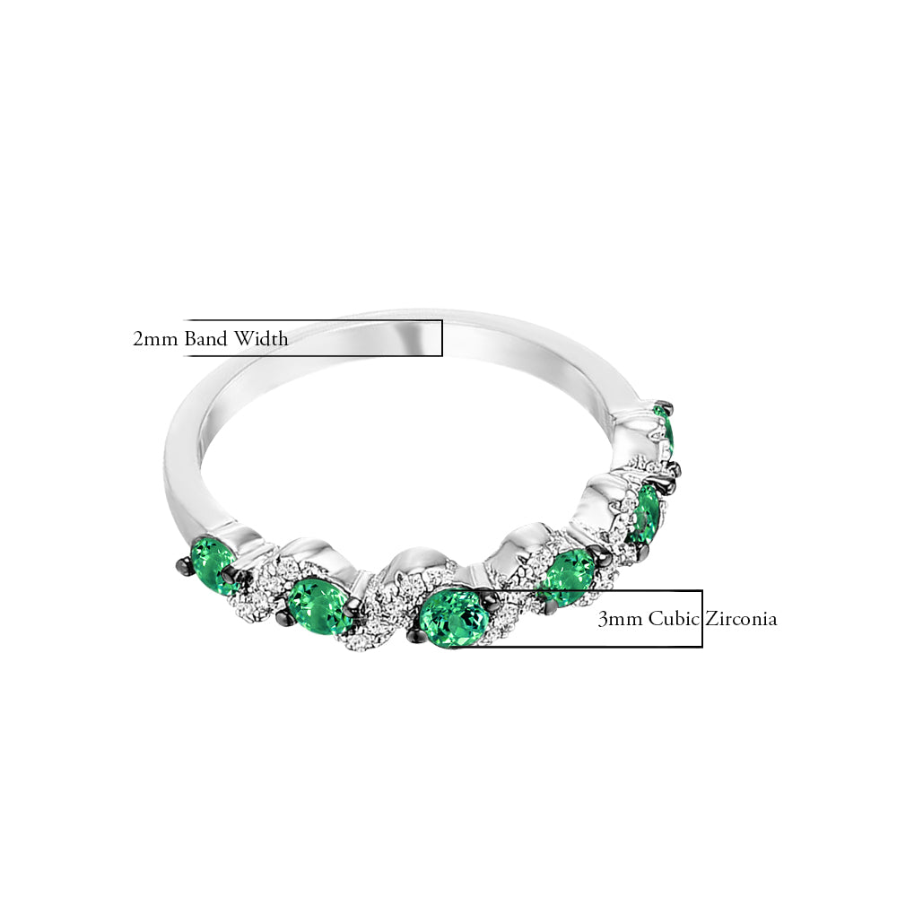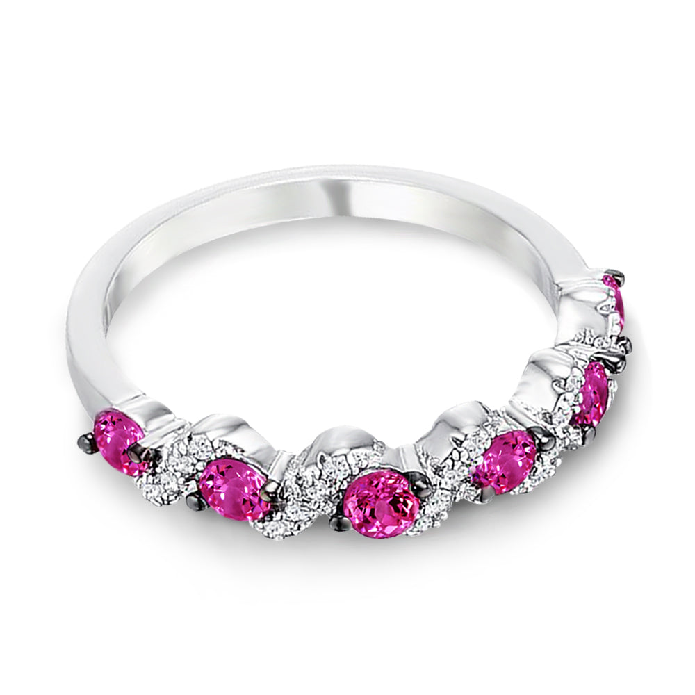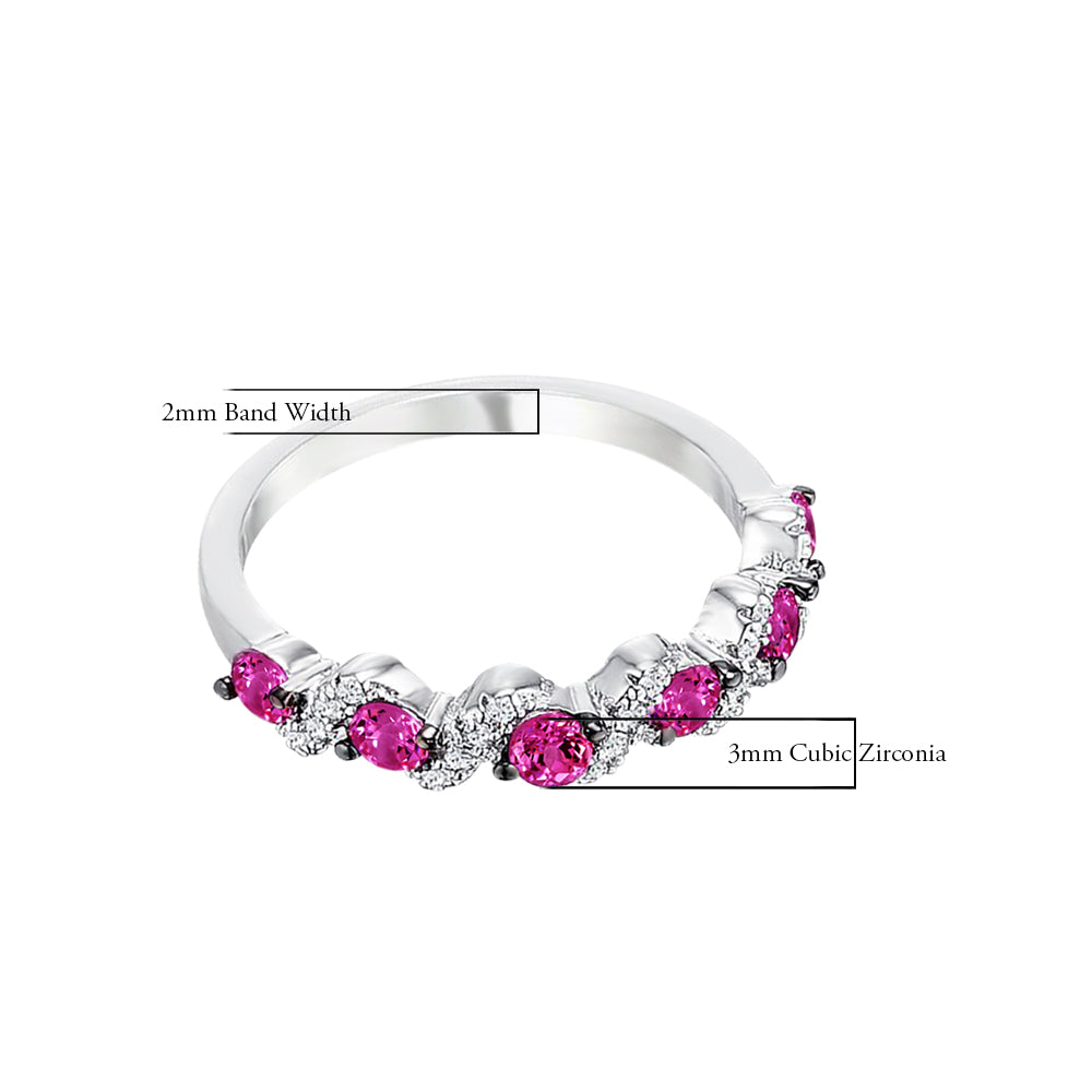 Invigorating green, pink and blue stones set between clear accents create dazzling bursts of colors in this contemporary wedding band design. The beauty of these eye-catching clusters of stones is further enhanced by the argent silver tone of genuine rhodium.