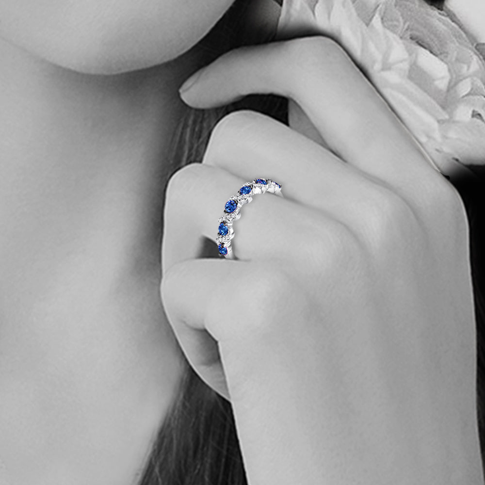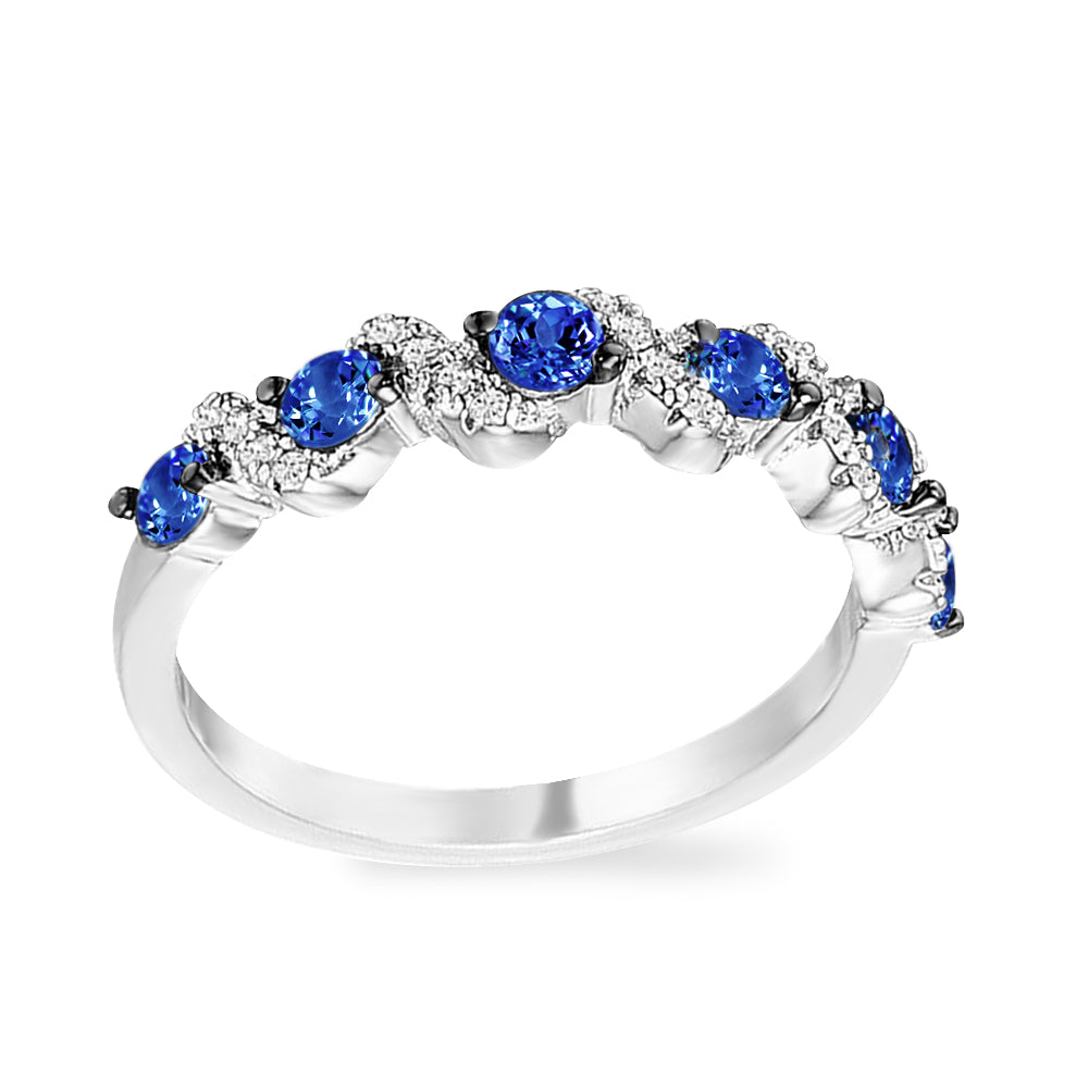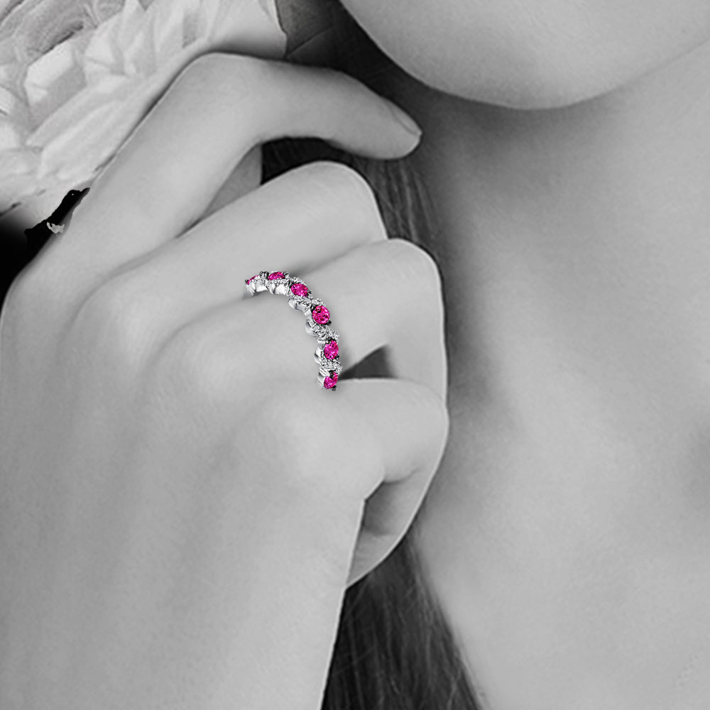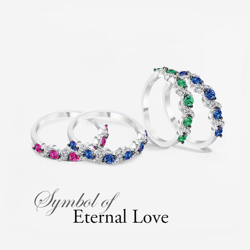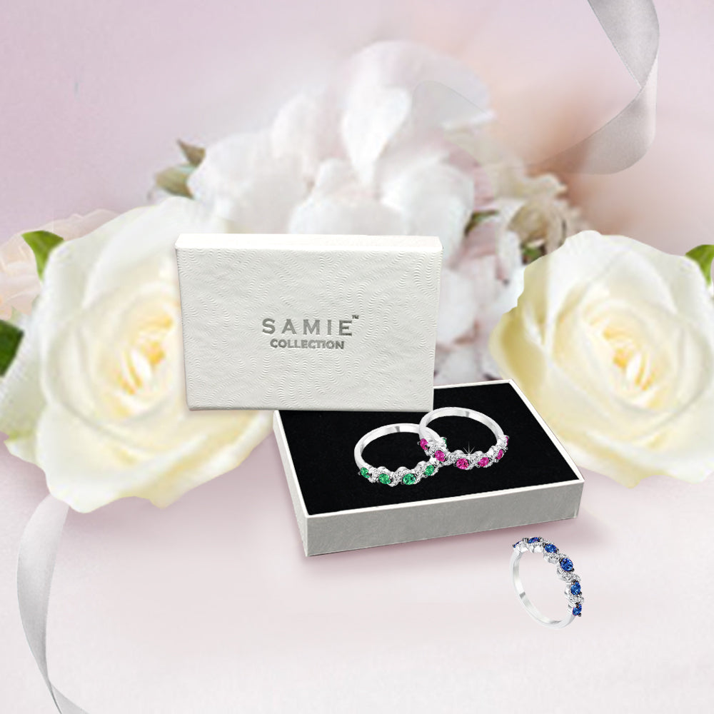 Invigorating green, pink and blue stones set between clear accents create dazzling bursts of colors in this contemporary wedding band design. The beauty of these eye-catching clusters of stones is further enhanced by the argent silver tone of genuine rhodium.
