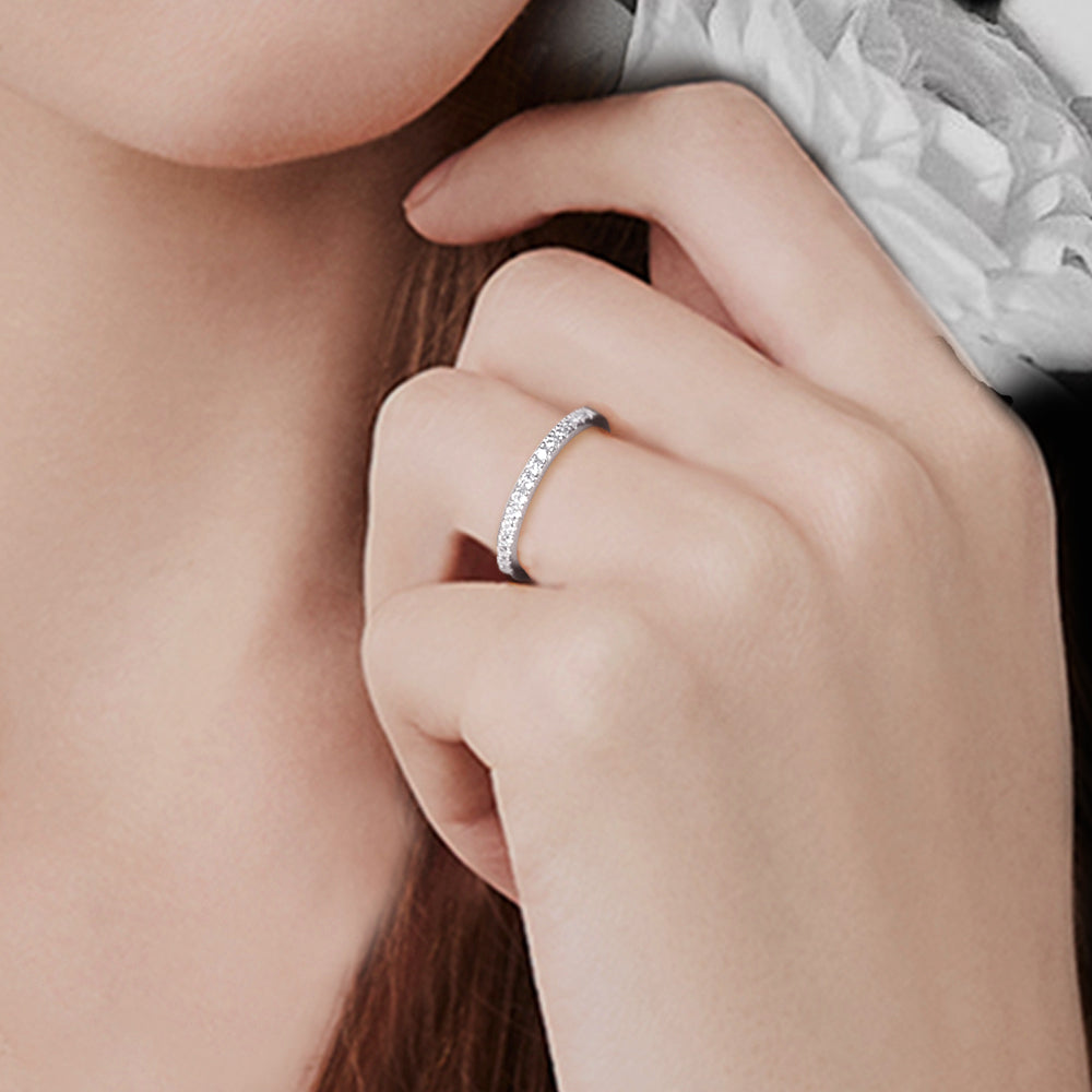 A timeless classic design - this eternity wedding band glows with a radiant silver hue featuring a full circle of brilliant round cut clear cubic zirconia stones set in channel setting. Simple, yet elegant; a beautiful ring to send the warmest love to your beloved.
