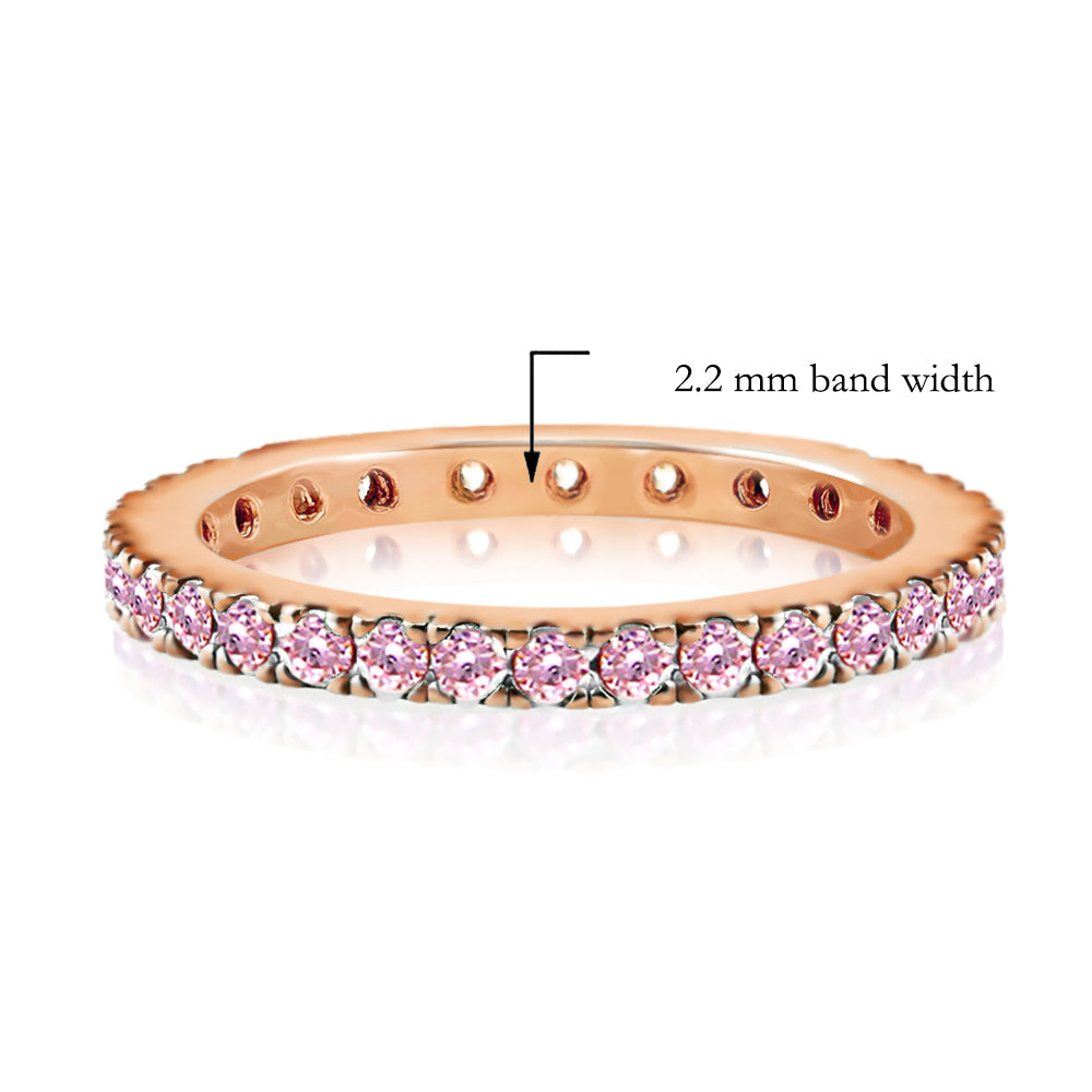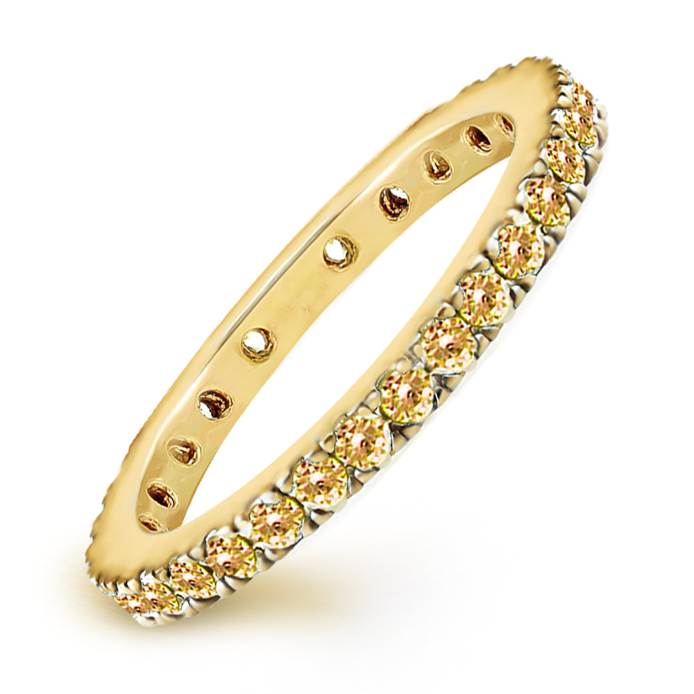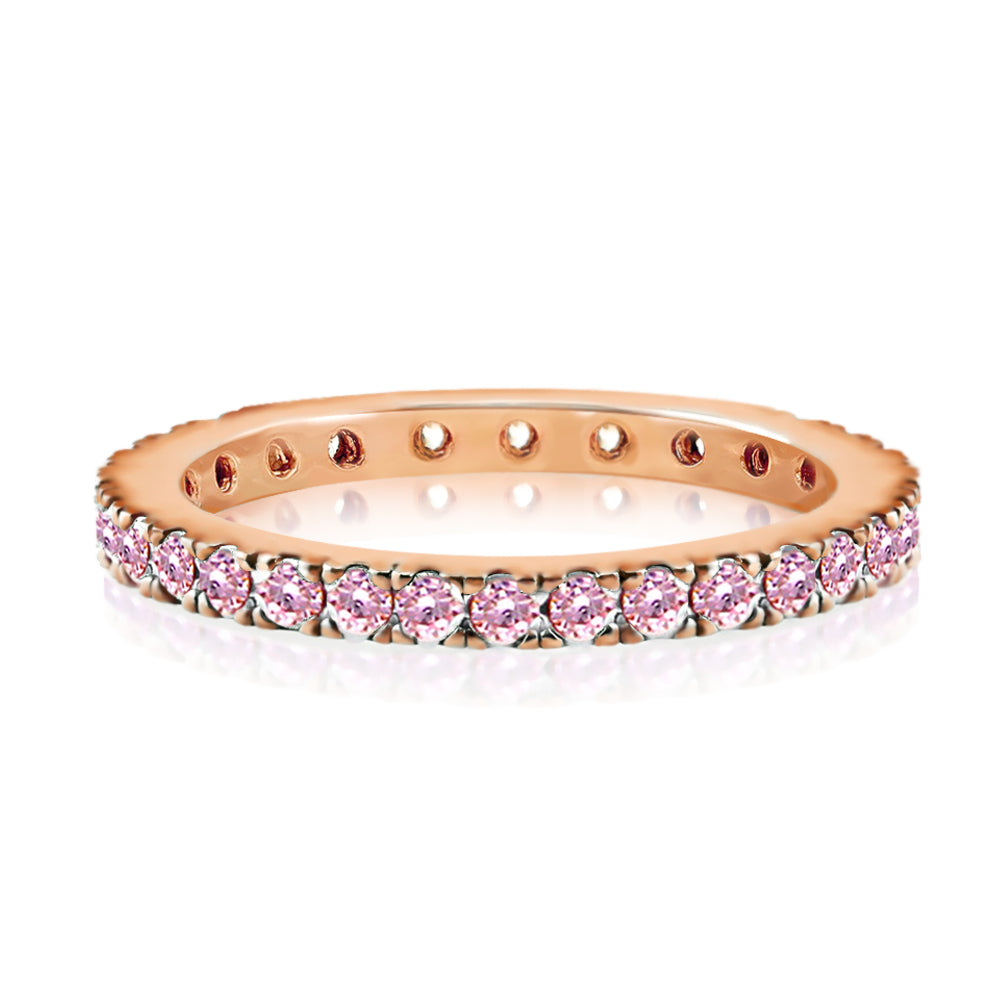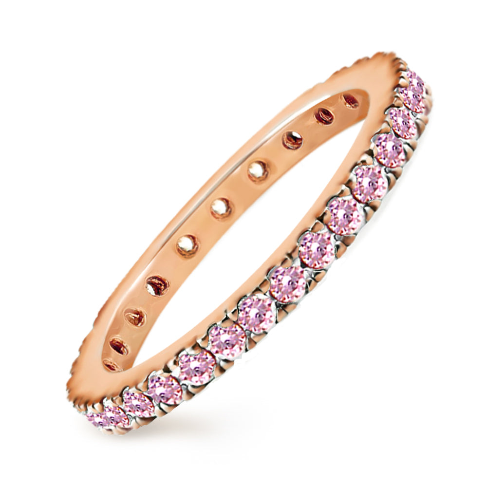 A timeless classic design - this eternity wedding band glows with a warm golden hue featuring a full circle of brilliant round cut pink and gold cubic zirconia stones set in channel setting. Simple, yet elegant; a beautiful ring to send the warmest love to your beloved.