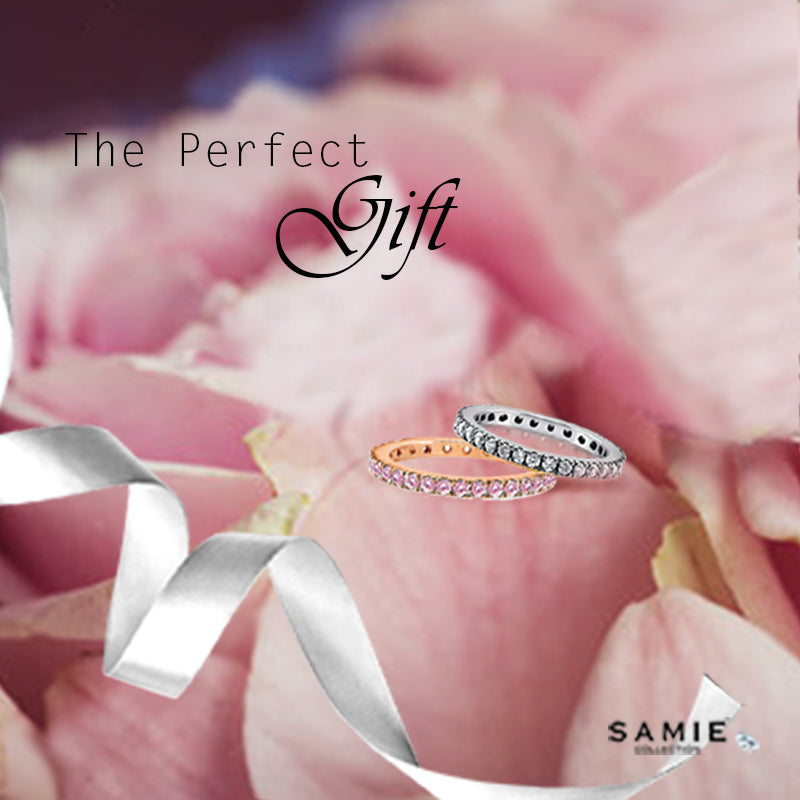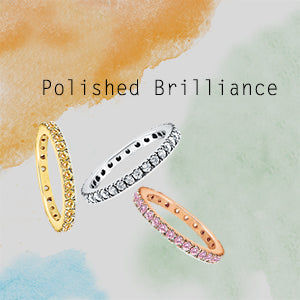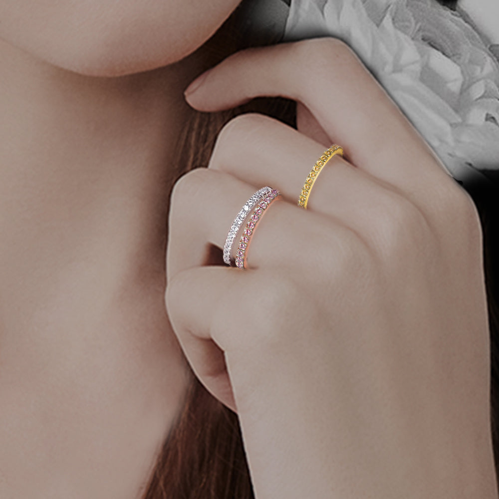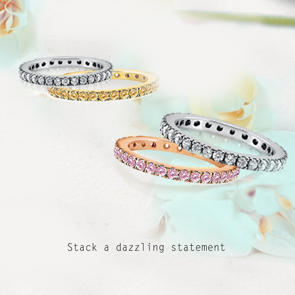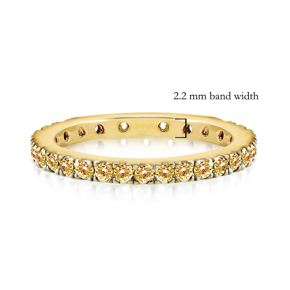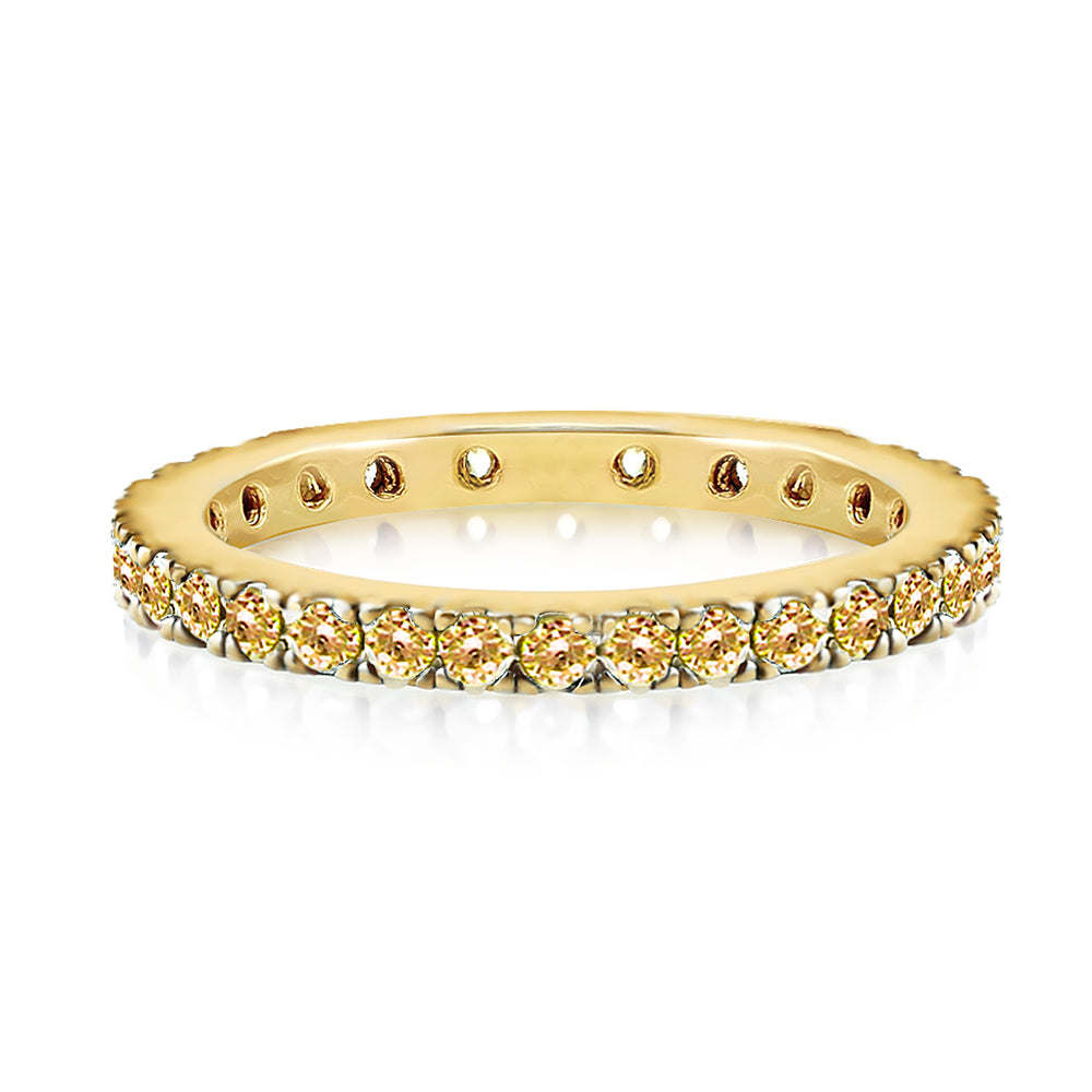 A timeless classic design - this eternity wedding band glows with a warm golden hue featuring a full circle of brilliant round cut pink and gold cubic zirconia stones set in channel setting. Simple, yet elegant; a beautiful ring to send the warmest love to your beloved.