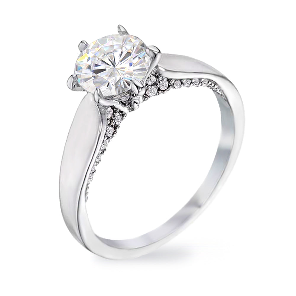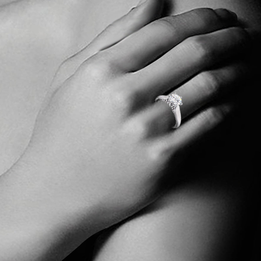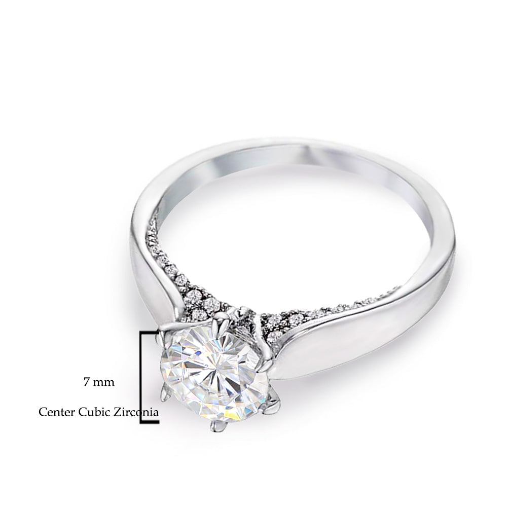 Give the love of your life the perfect combination of sleek and elegant with the Harmony wedding engagement ring. A graceful twist on the timeless solitaire design, this ring features a brilliant round cut center stone is held in place by six prongs above small accent stones in pavé setting, adding a subtle touch of brilliance under a smooth silver tone band.