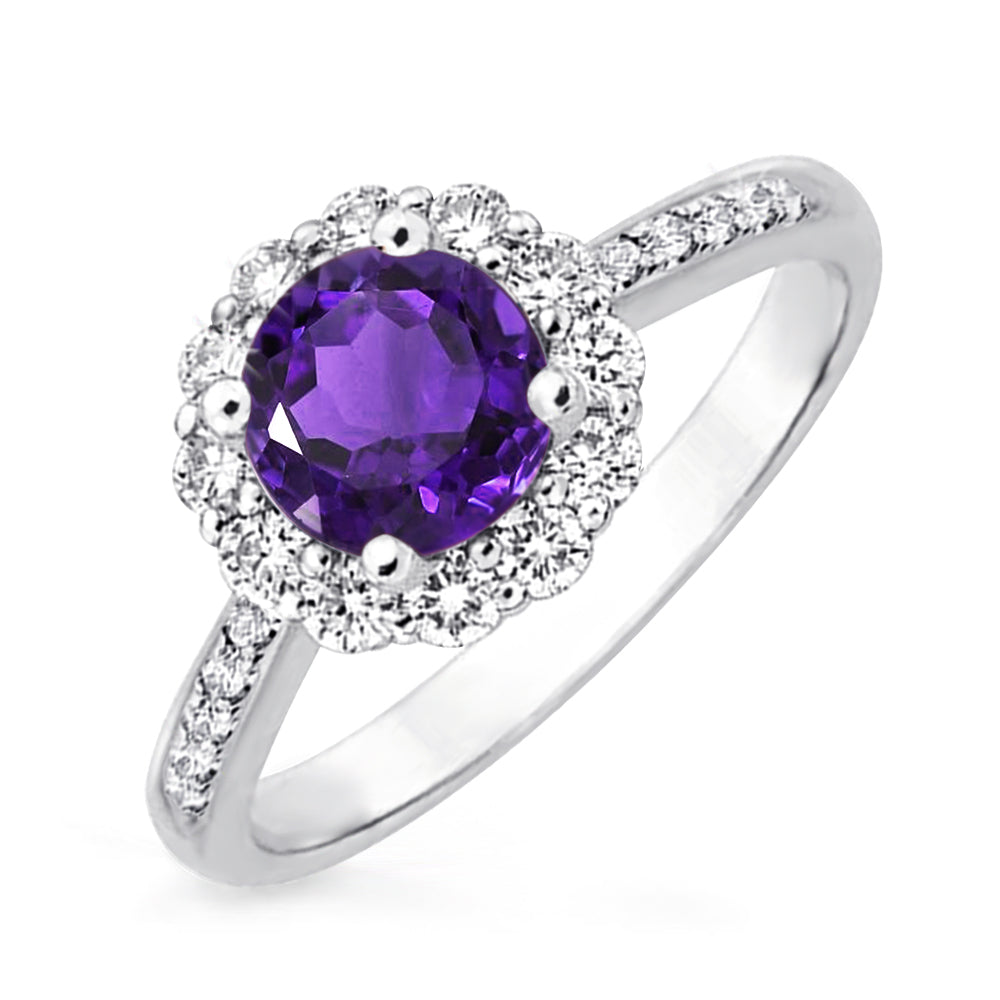Featuring a halo design, our February birthstone engagement ring features an alluring center stone with Amethyst color. The clear accents and lustrous silver tone capture the light, enhancing the beauty of your birth color.