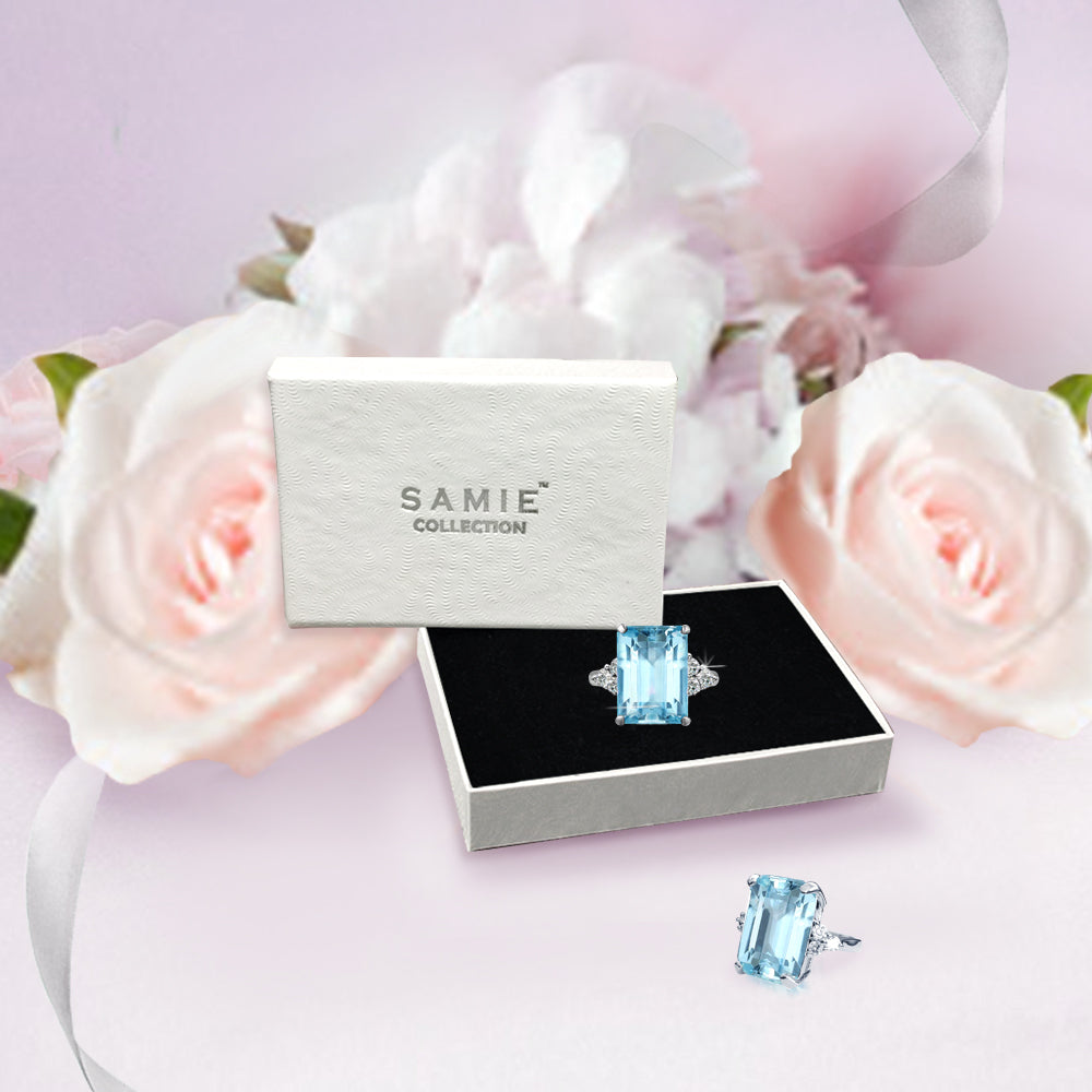 Inspired by the late Princess Diana's cocktail ring, made famous by Princess Meghan Markle, this breathtaking ring features a 19.5 carat aquamarine emerald cut center stone. Glittering clear accent stones sit on both sides of the center stone for a spectacular show of light.