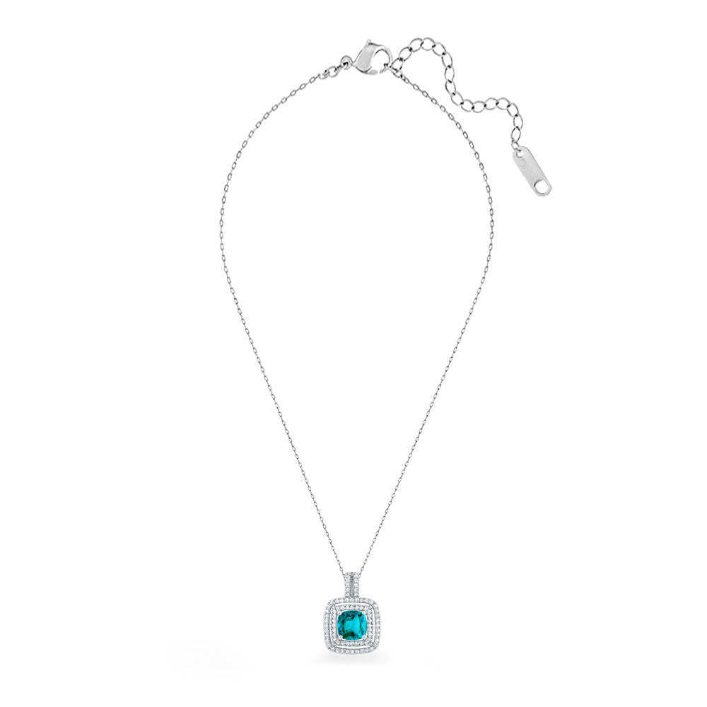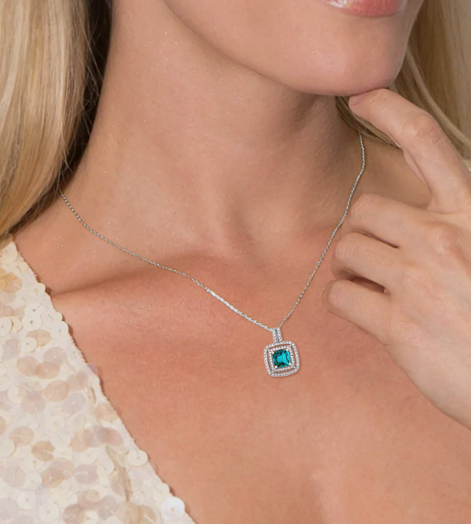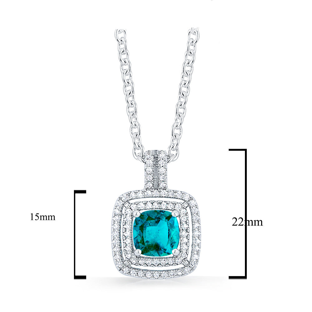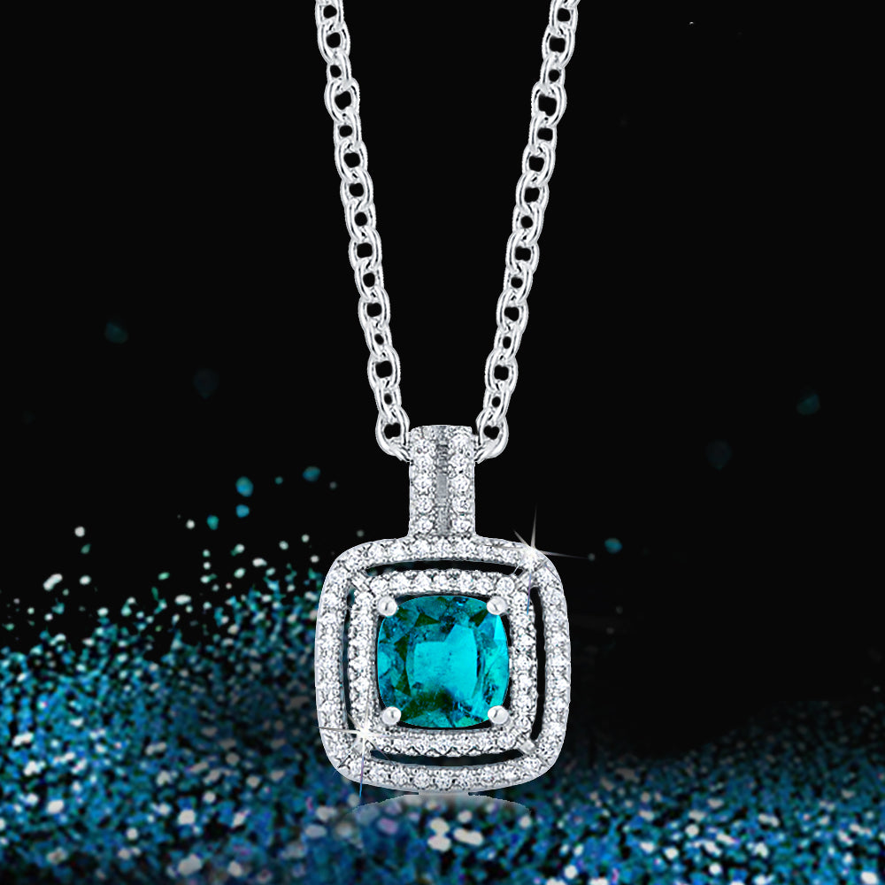 This halo pendant necklace features a stunning turquoise cubic zirconia centerpiece encircled by a double row of round cut clear accents. A dazzling pendant hook with cubic zirconia serves to enhance the striking magnificence of this piece.