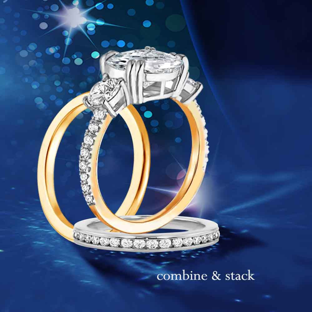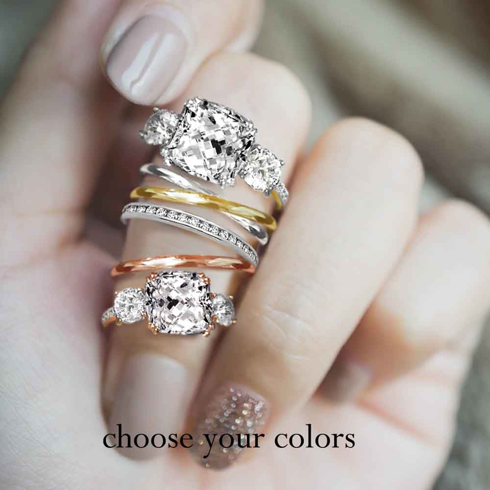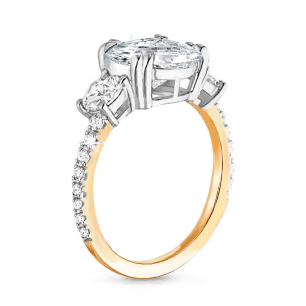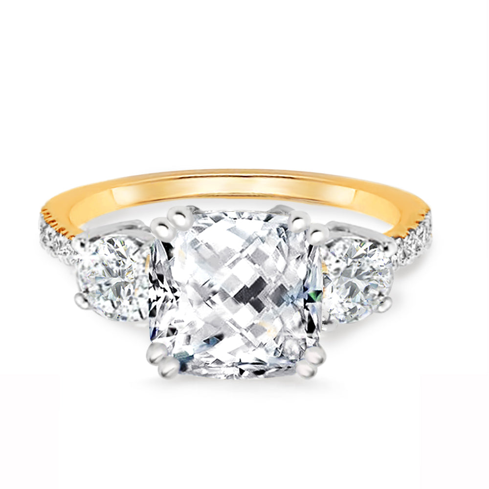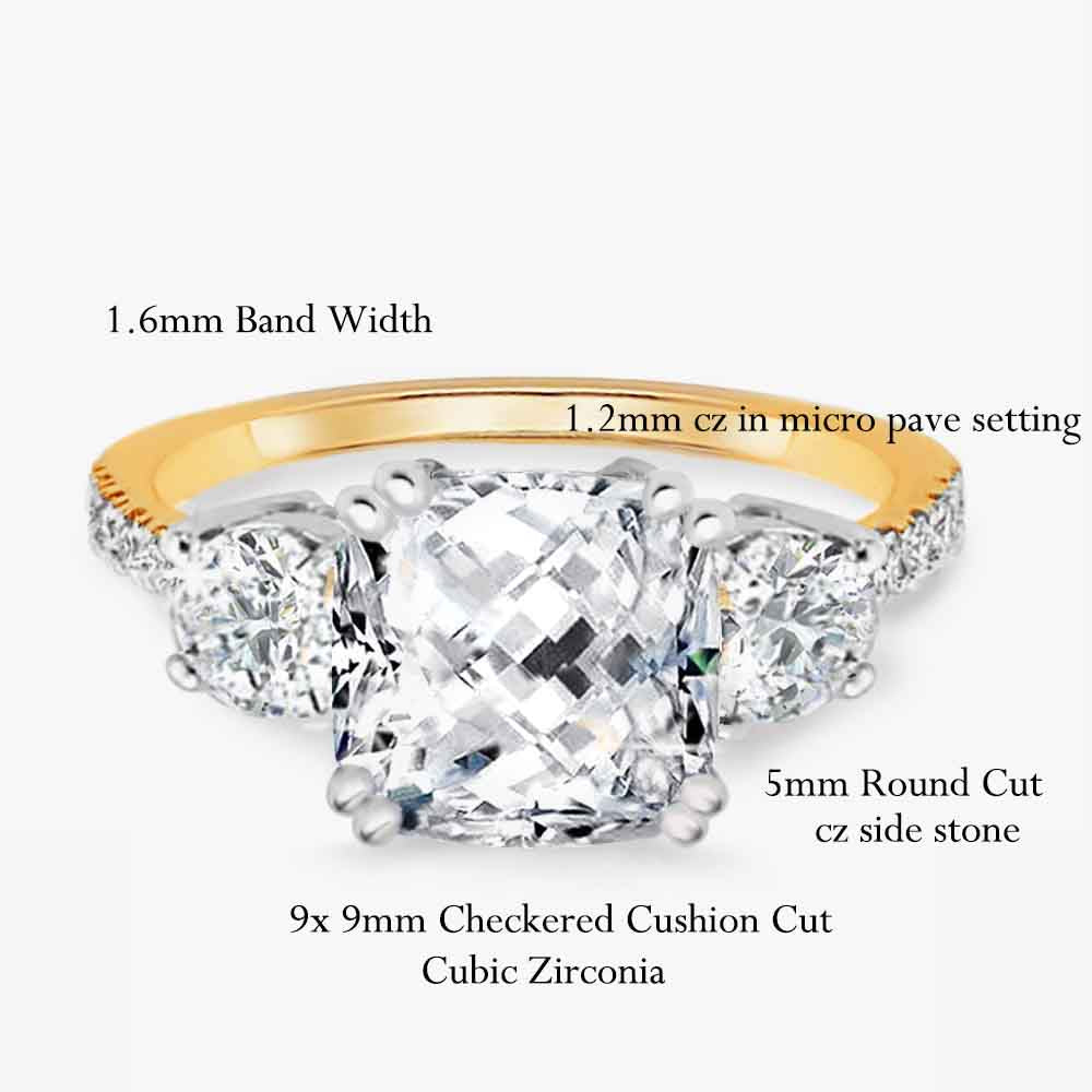 Regal and contemporary, this engagement ring features a clear checkered cushion cut center stone with two brilliant round cut stones on the side. The dazzling arrangement is accompanied by an ensemble of accent stones in silver tone micro pavé setting on a yello gold plated band, creating a luxurious two tone band. This ring can is stackable to complete the royal bridal set look.
