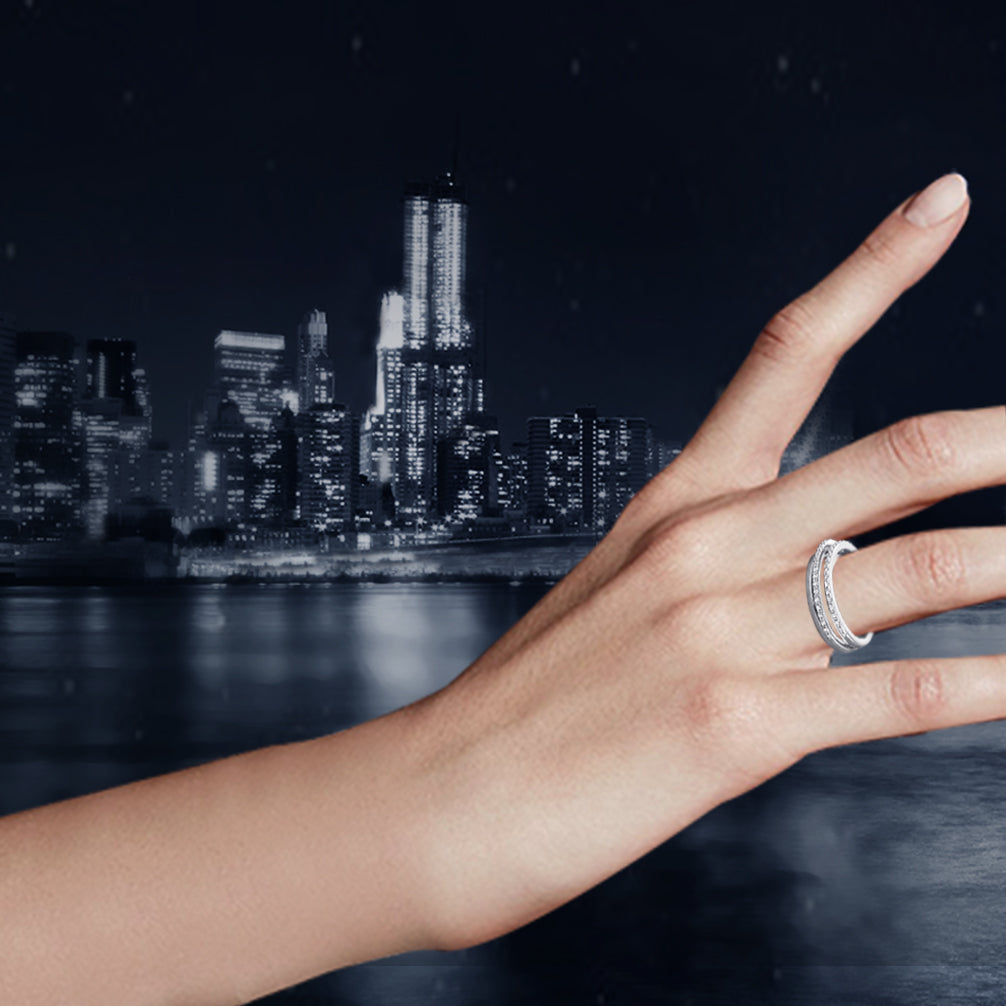 With sparkling cubic zirconia in pavé setting and genuine rhodium plating, this must-have stackable ring adds instant glamour to your look. Ideal for everyday wear and easy to mix and match with other pieces from Samie Collection jewelry, it would make a perfect gift.