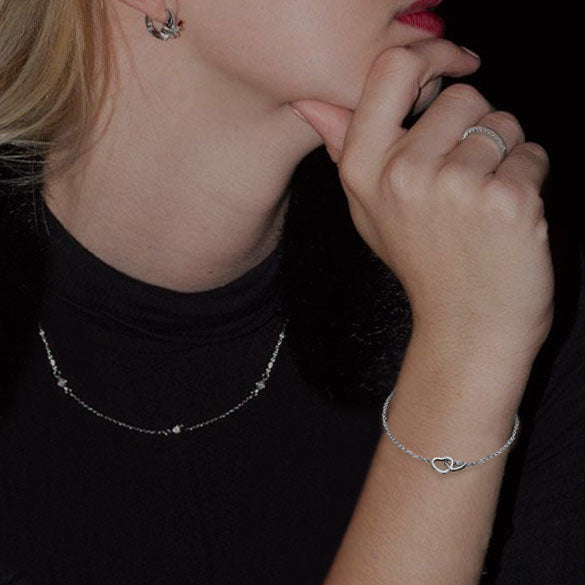 A sleek entwined open heart charm, a symbol of everlasting love; this bracelet the is perfect gift for your loved one. The little rhodium plated hearts display a lovely modern touch. Delicate and easy to wear, it combines perfectly with the matching necklace and ring.