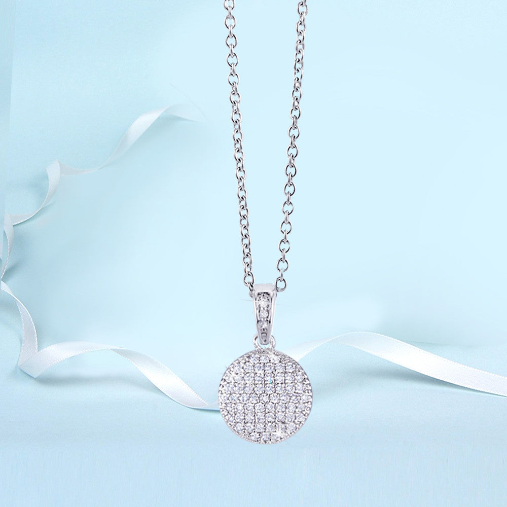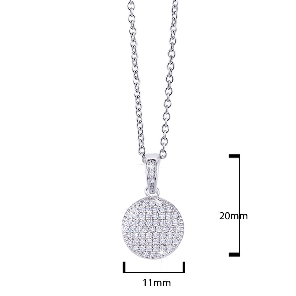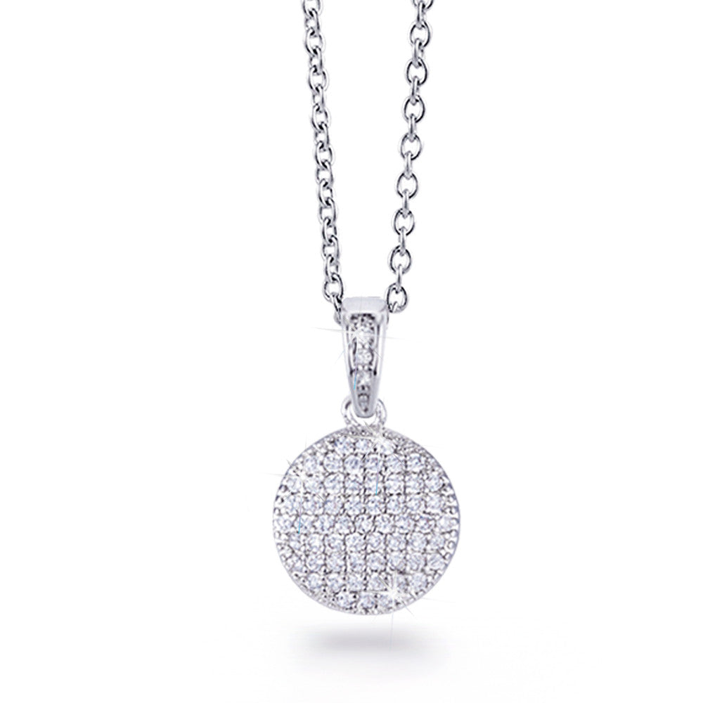 This contemporary circle pendant necklace is perfect for mixing and matching styles for that fashionista look. It features a disc embellished with sparkling cubic zirconia in pave setting in rhodium-plating.