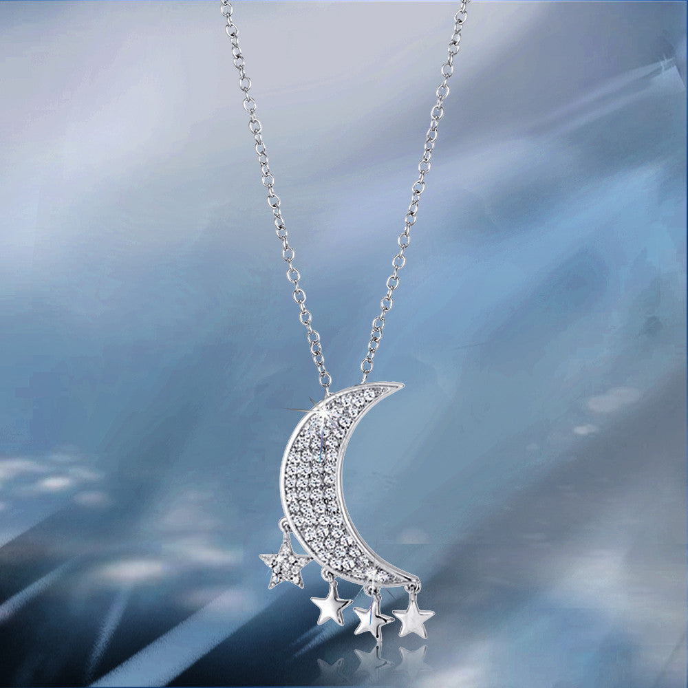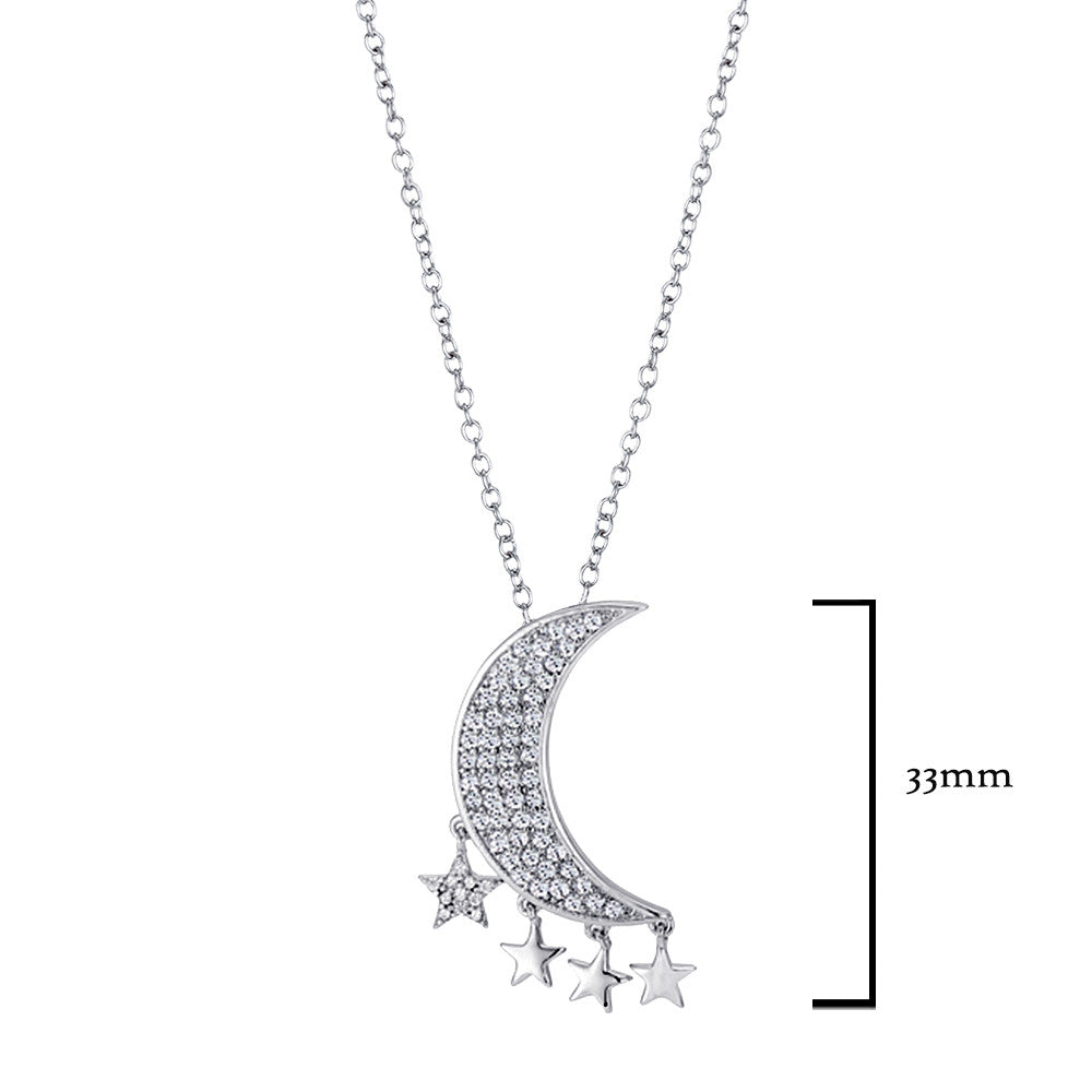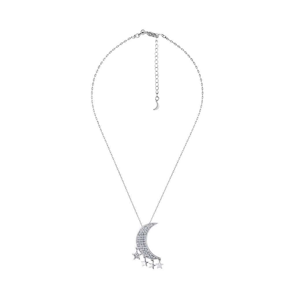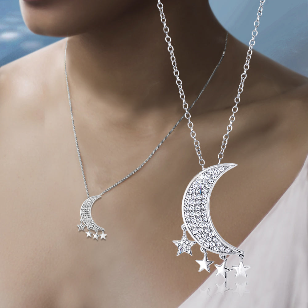 This sparkling necklace uses a unique combination of moon and stars for a distinctly romantic look. Four delicate little stars dangle from a pavé-embellished twinkling crescent moon pendant. This elegant pendant makes it as appropriate for day as it is for evening.
