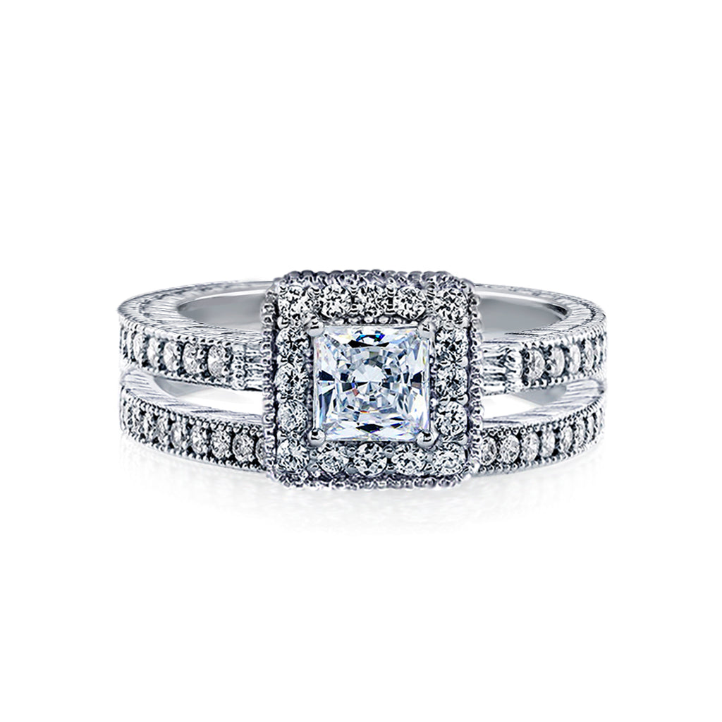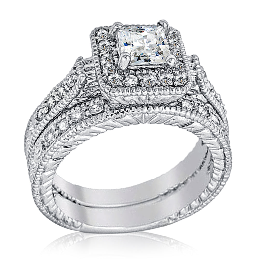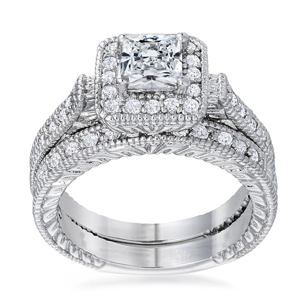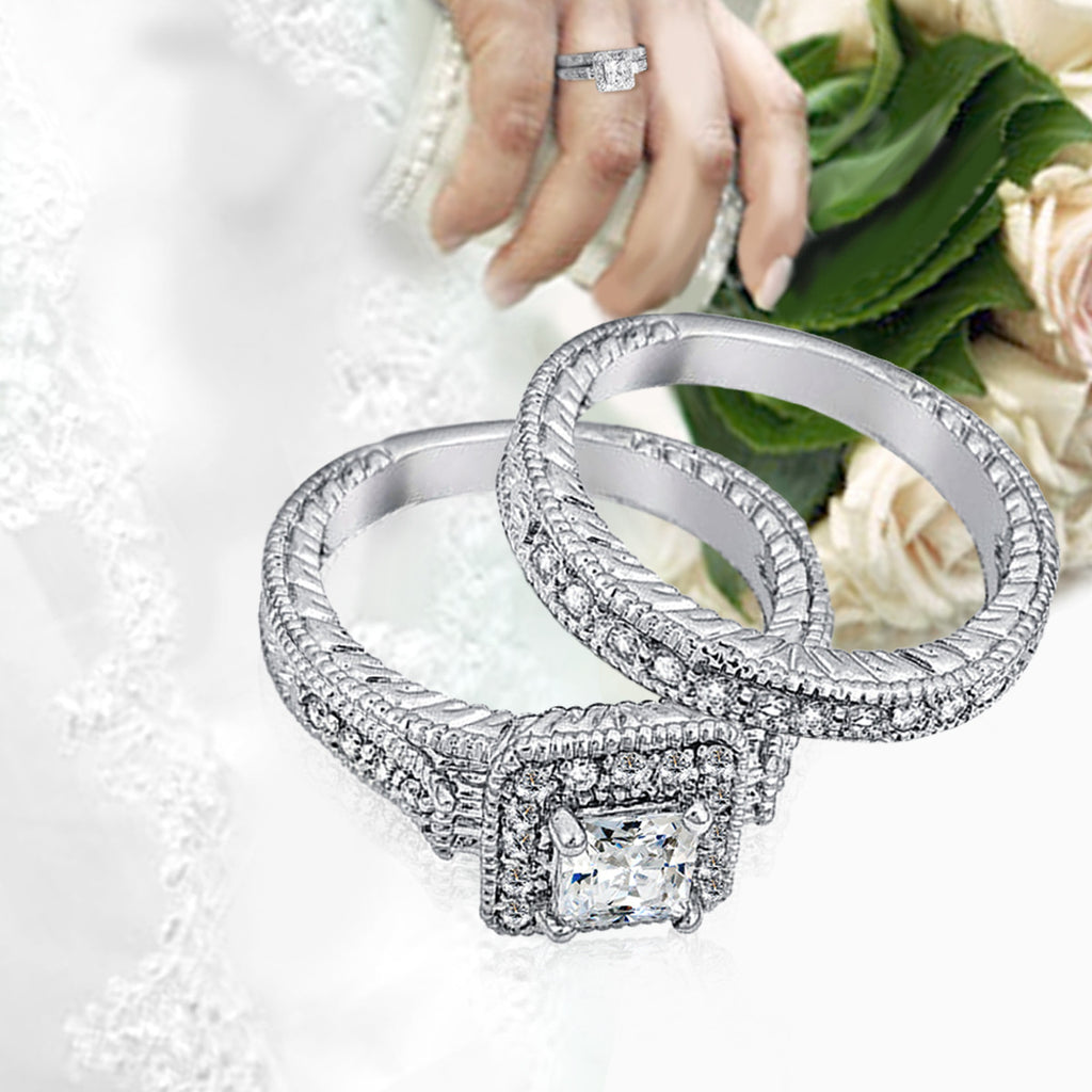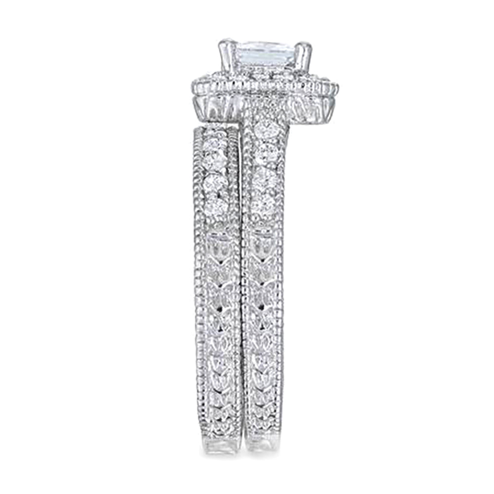 This Vintage Halo Wedding Ring Set is made with Heavy Layered Genuine Rhodium Plating with Top Quality Cubic Zirconia. This Ring Set is Sure to Grab the Attention of Everyone.