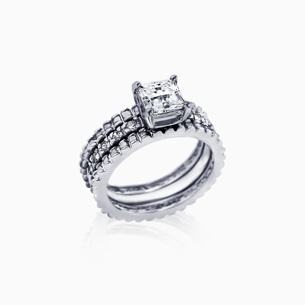 This Unique yet Classic Solitaire Wedding Ring Set is made with Heavy Layered Genuine Rhodium Plating with Top Quality Princess Cut Cubic Zirconia Set with 2 Eternity Bands. This is Perfect to Show Your Deep Affection to the One You Love.