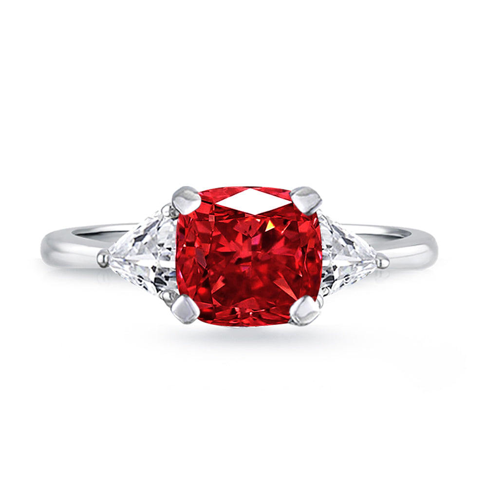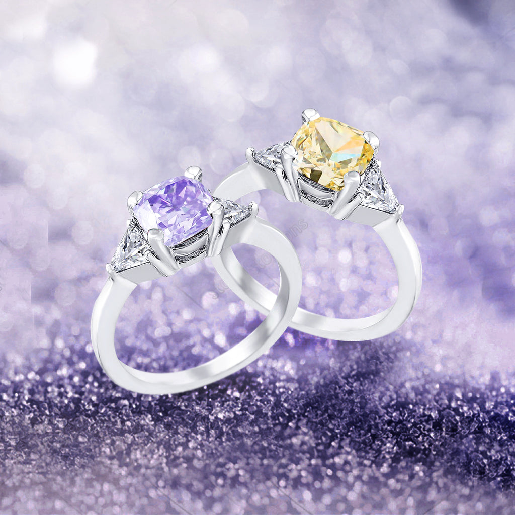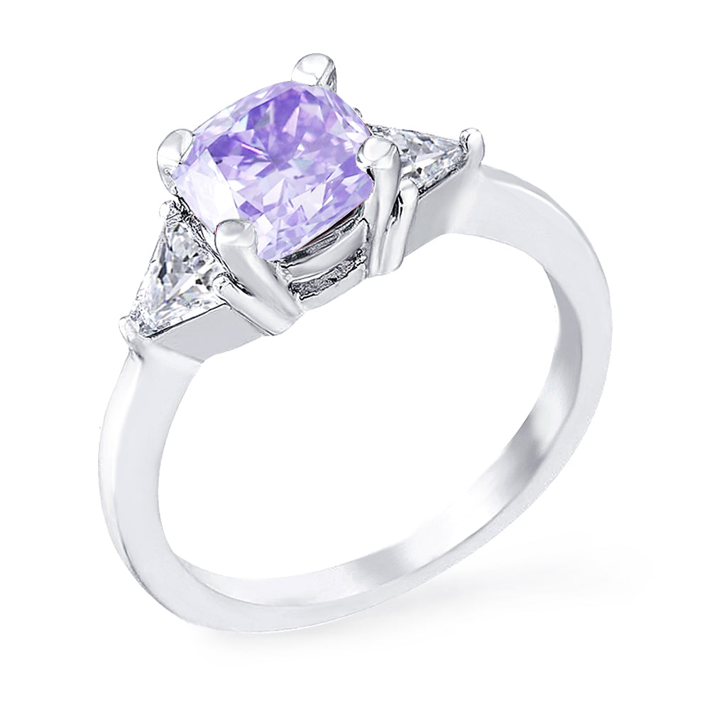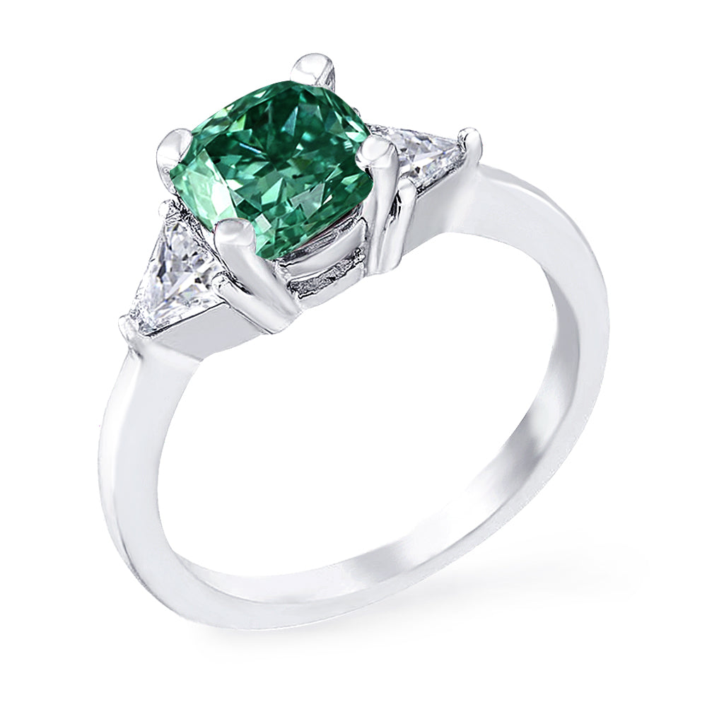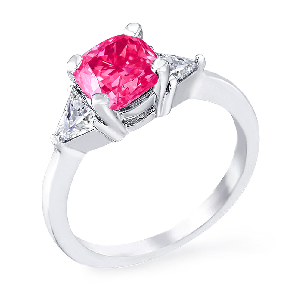3 Stone with cushion-cut cubic zirconia center stone creates air of glamour with 2 trillion-cut side stones. Painstakingly matched quality and proportion.