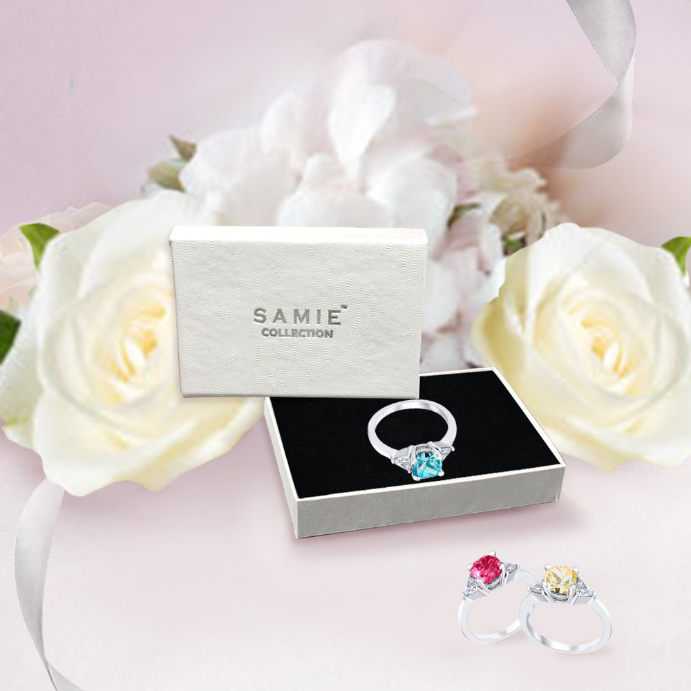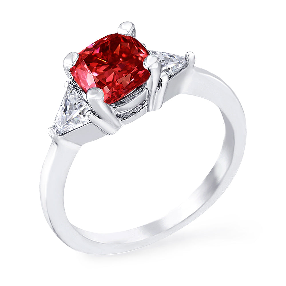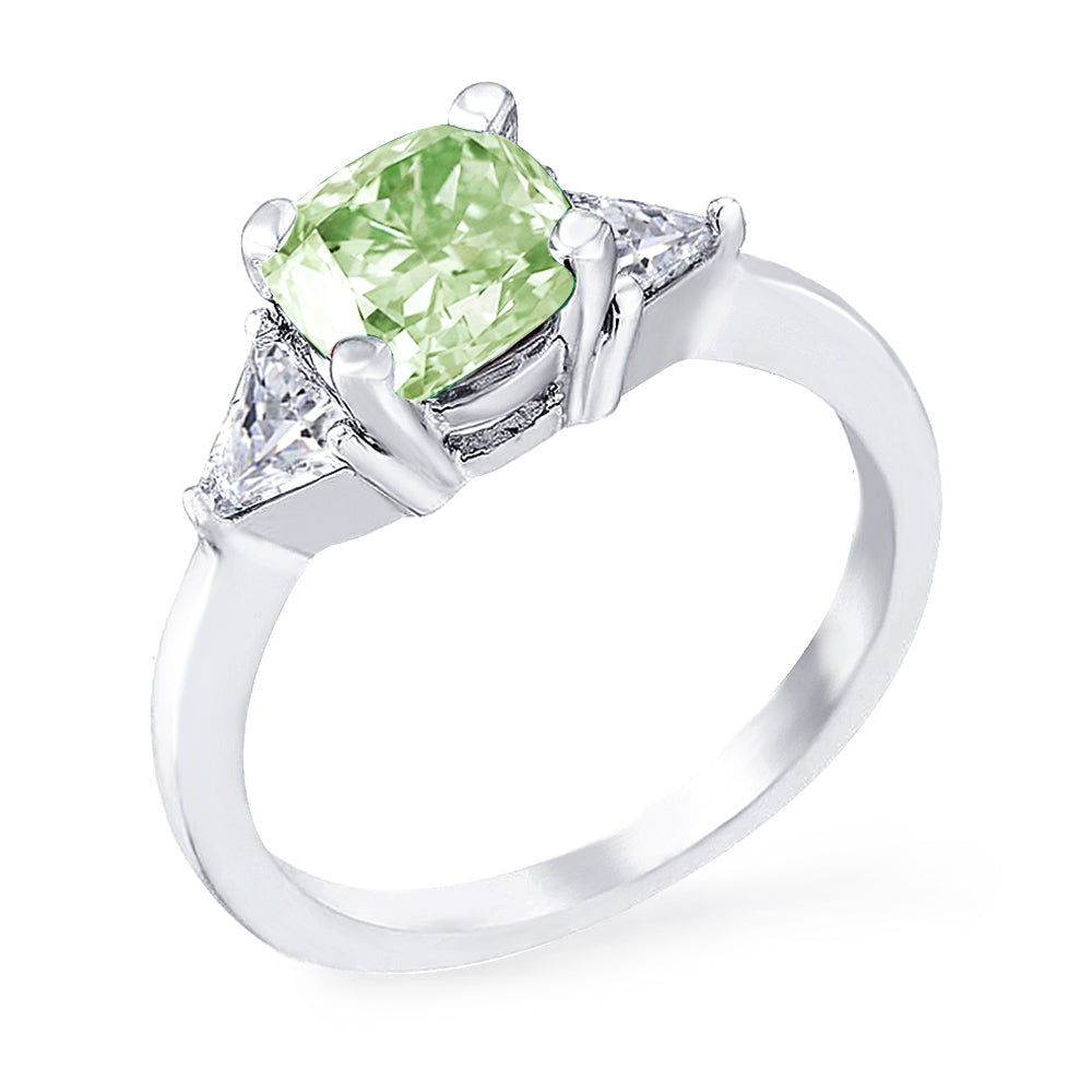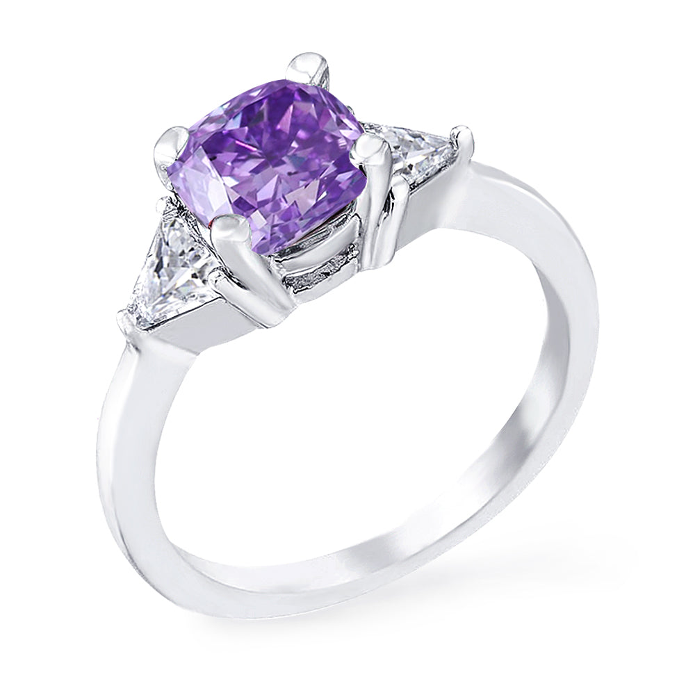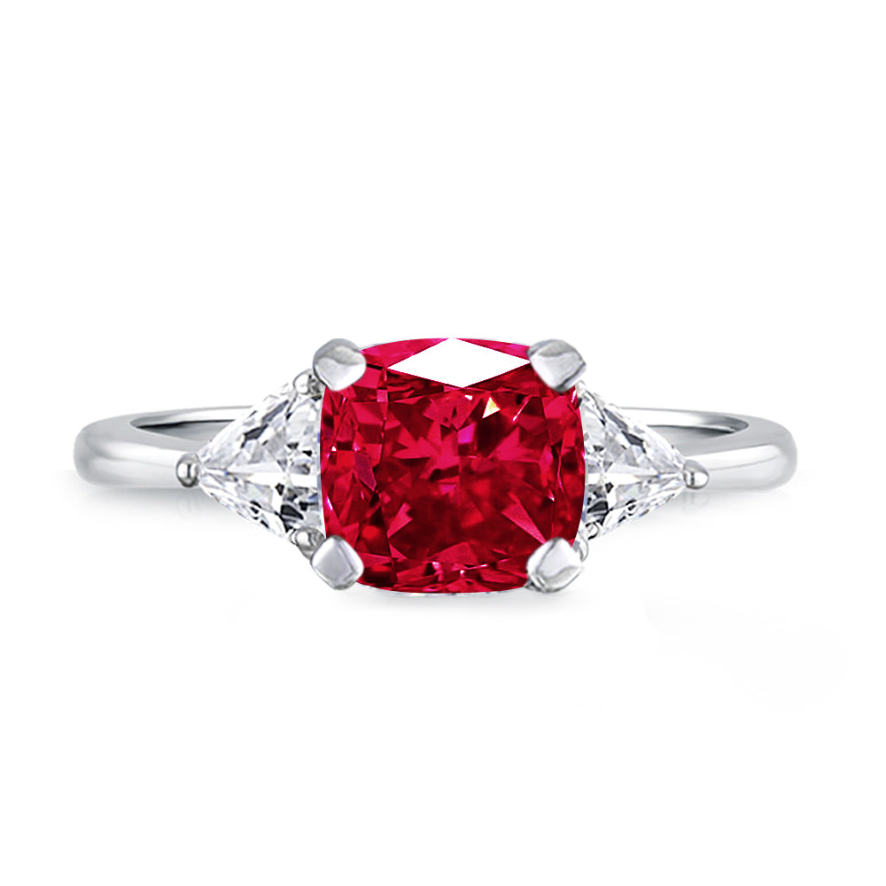 3 Stone with cushion-cut cubic zirconia center stone creates air of glamour with 2 trillion-cut side stones. Painstakingly matched quality and proportion.