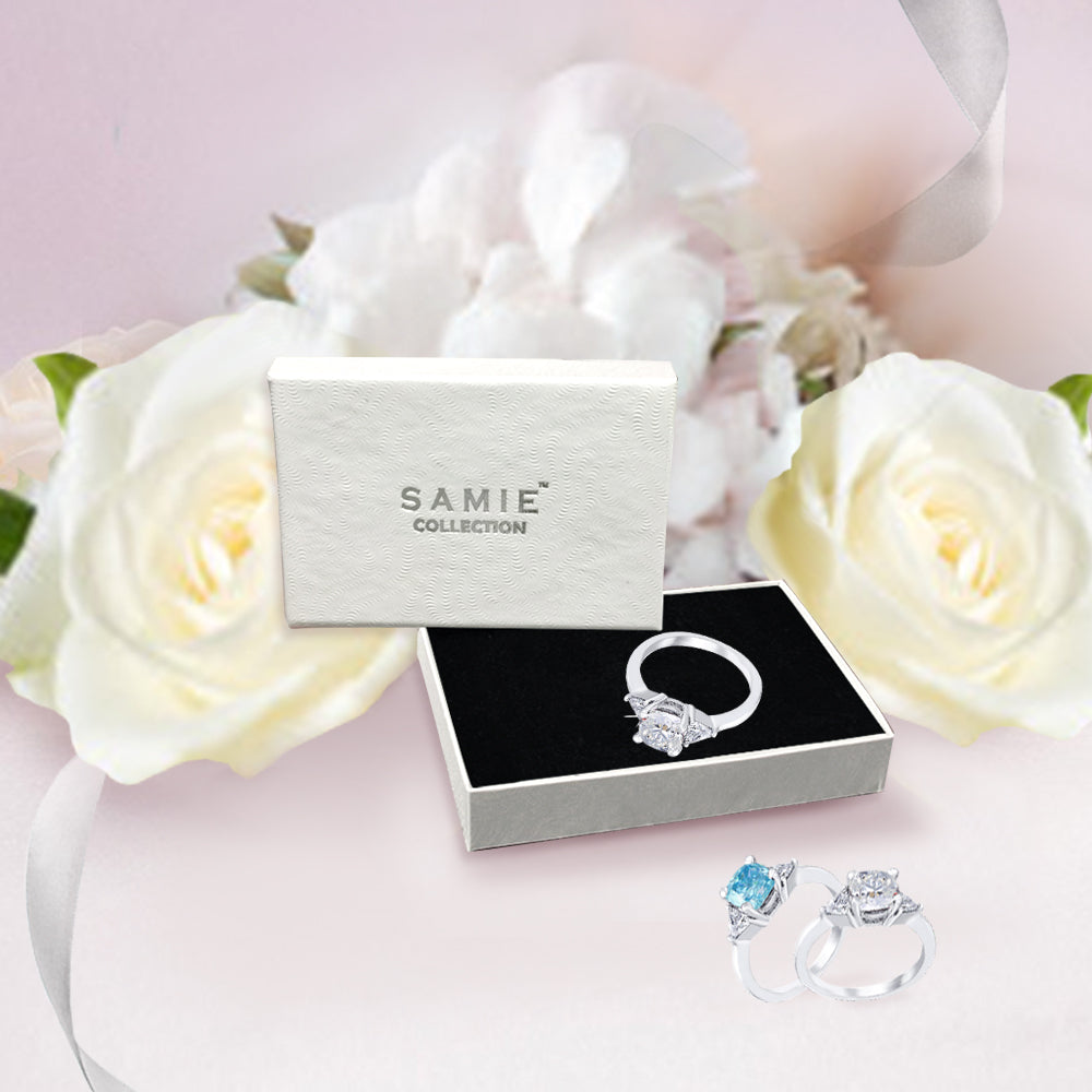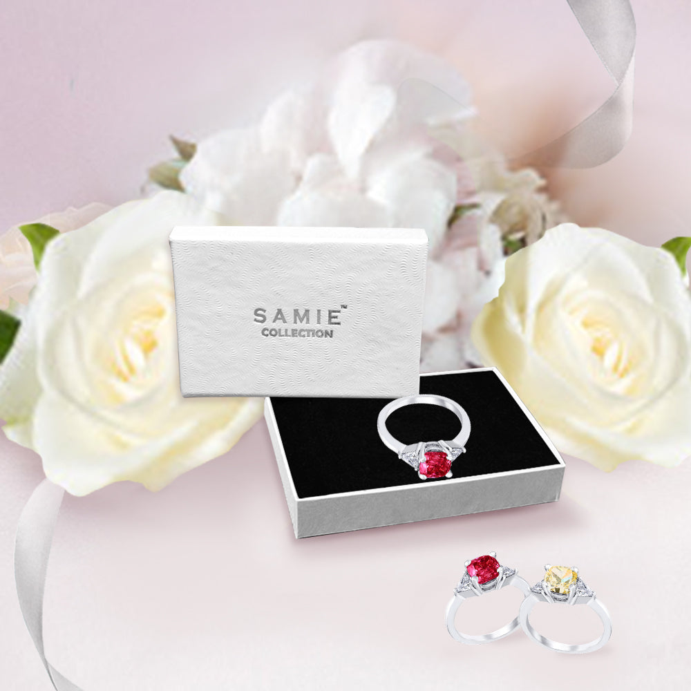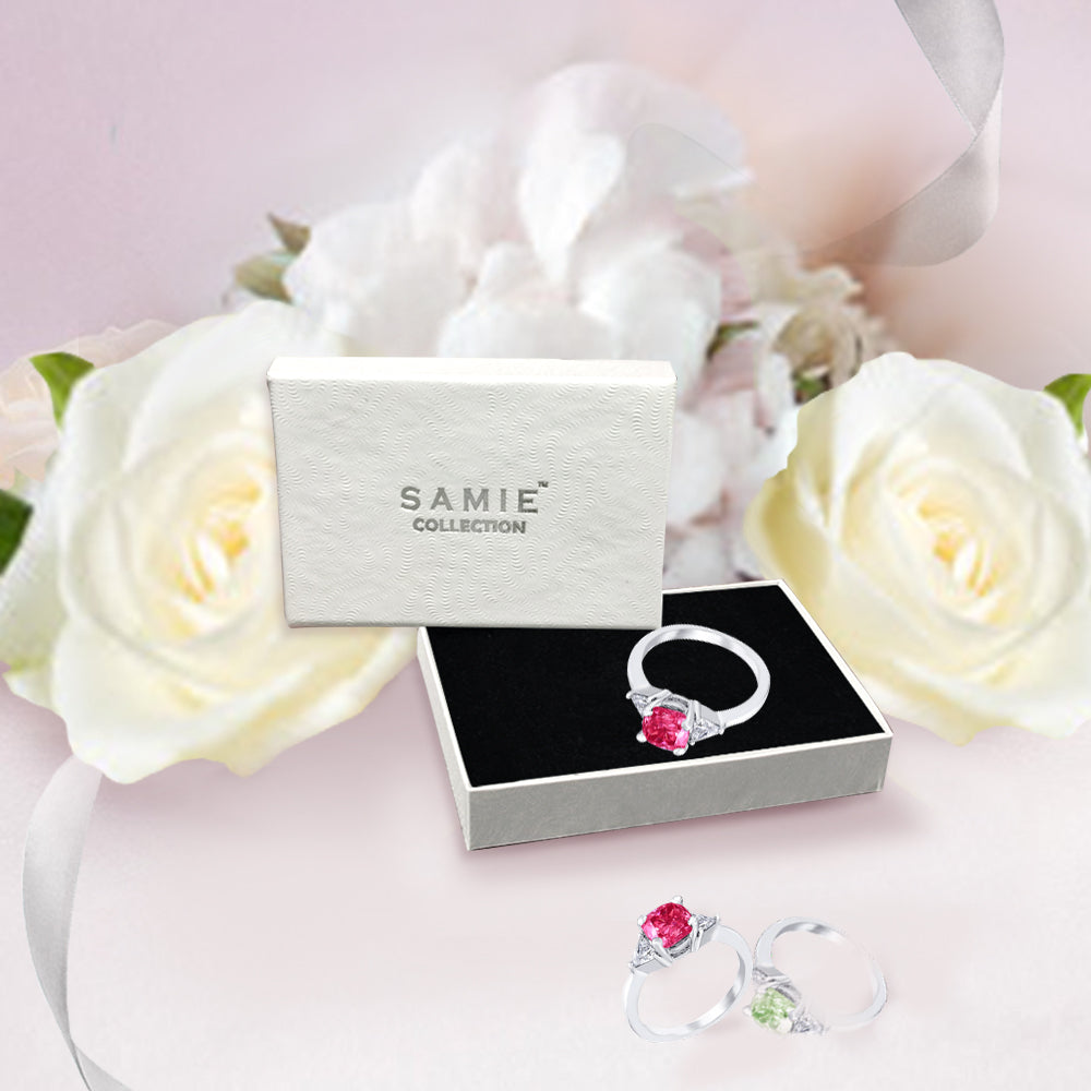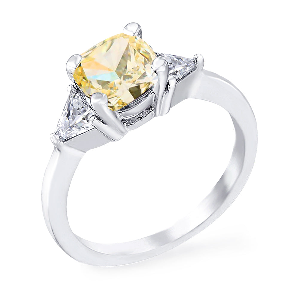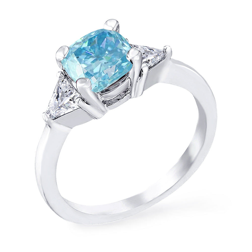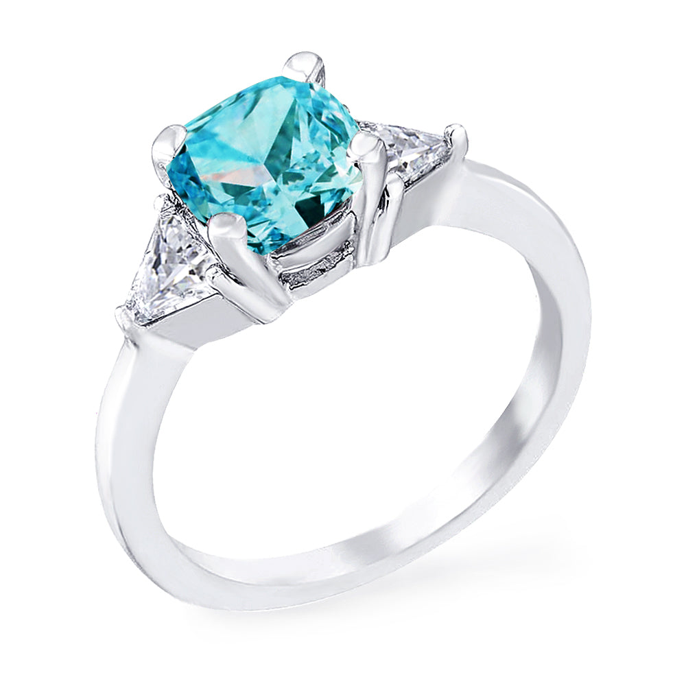 3 Stone with cushion-cut cubic zirconia center stone creates air of glamour with 2 trillion-cut side stones. Painstakingly matched quality and proportion.