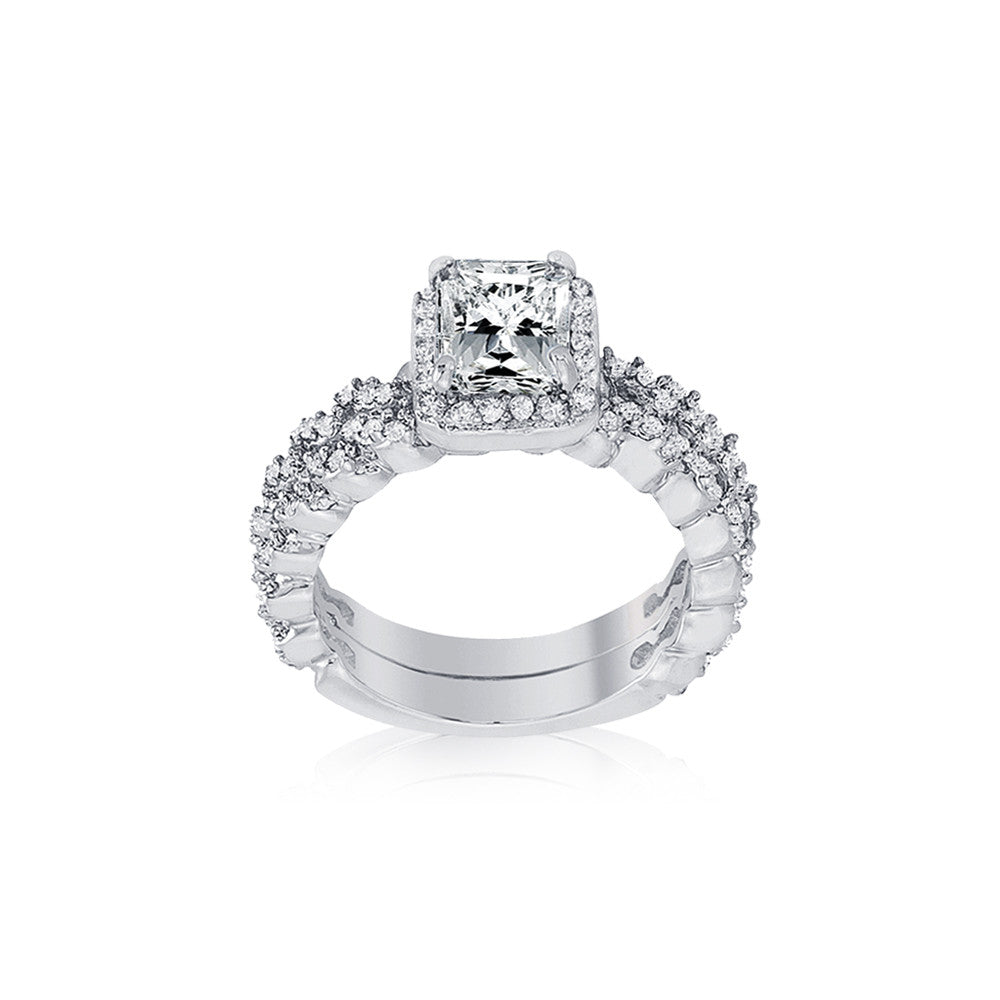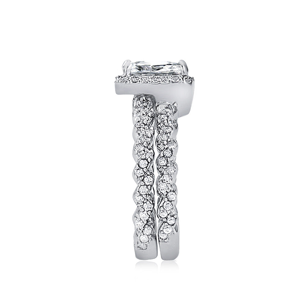 This Unique Vintage Halo Wedding Ring Set is made with Heavy Layered Genuine Rhodium Plating and Top Quality Cubic Zirconia. Features 1.5 Carat Center Radiant Cubic Zirconia Accented with Sparkling CZ stones.