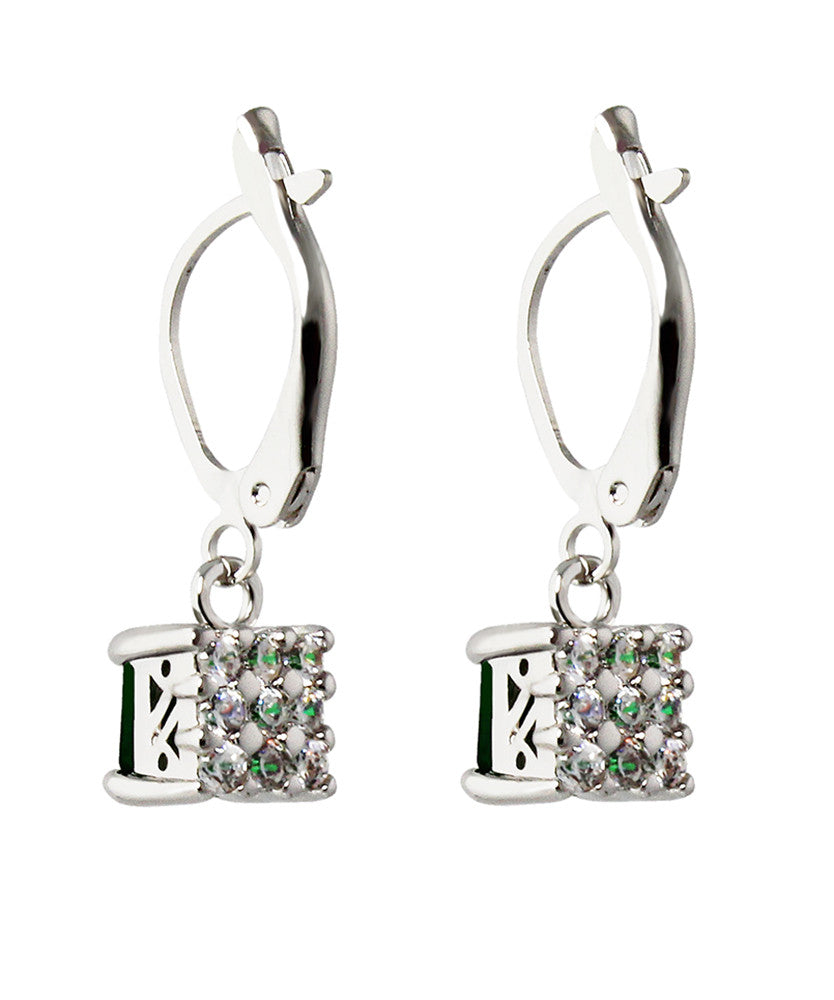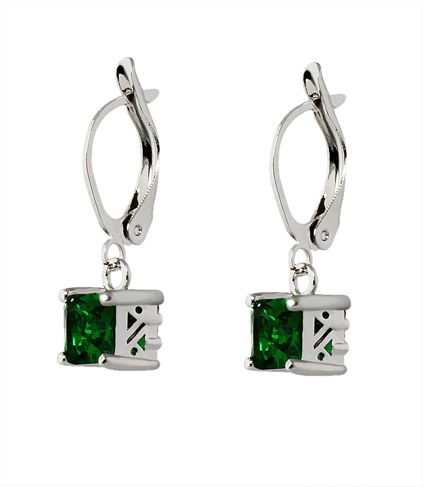 Timeless elegant dangle earrings made with rhodium plating and princess emerald green cubic zirconia in prong setting and round brilliant cubic zirconia in pave setting. 3.02 carat total weight.
