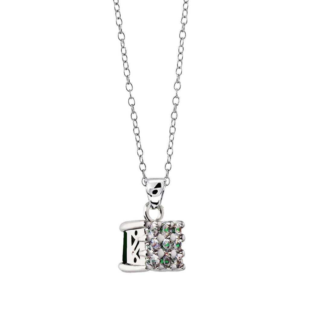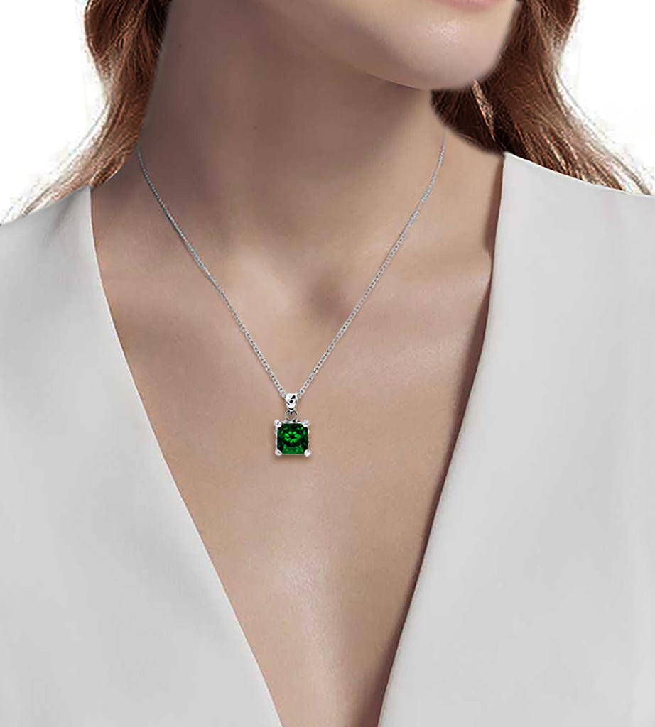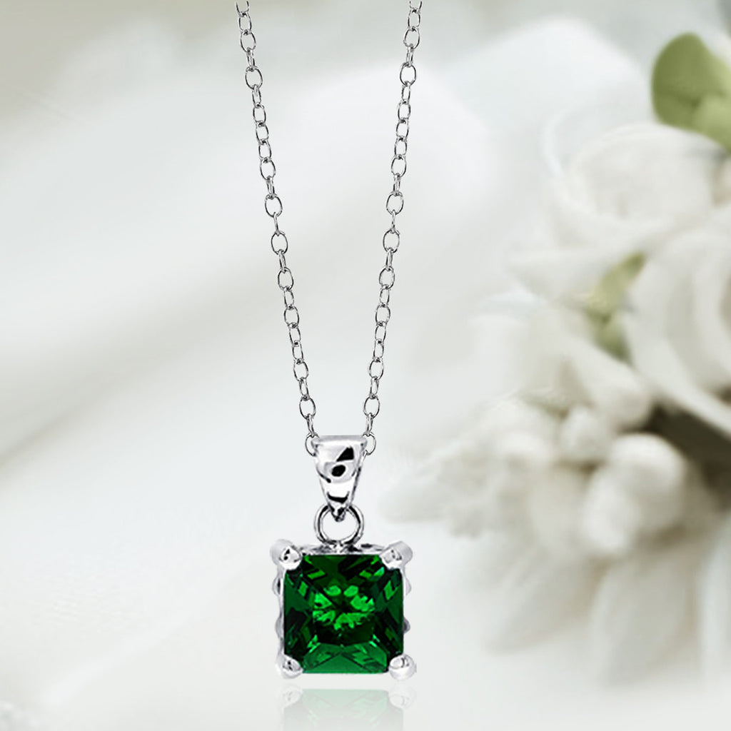 Timeless elegant solitaire pendant necklace made with rhodium plating and princess-cut emerald green cubic zirconia in prong setting and 9 round brilliant cubic zirconia in pave setting. 3.02 carat total weight.
