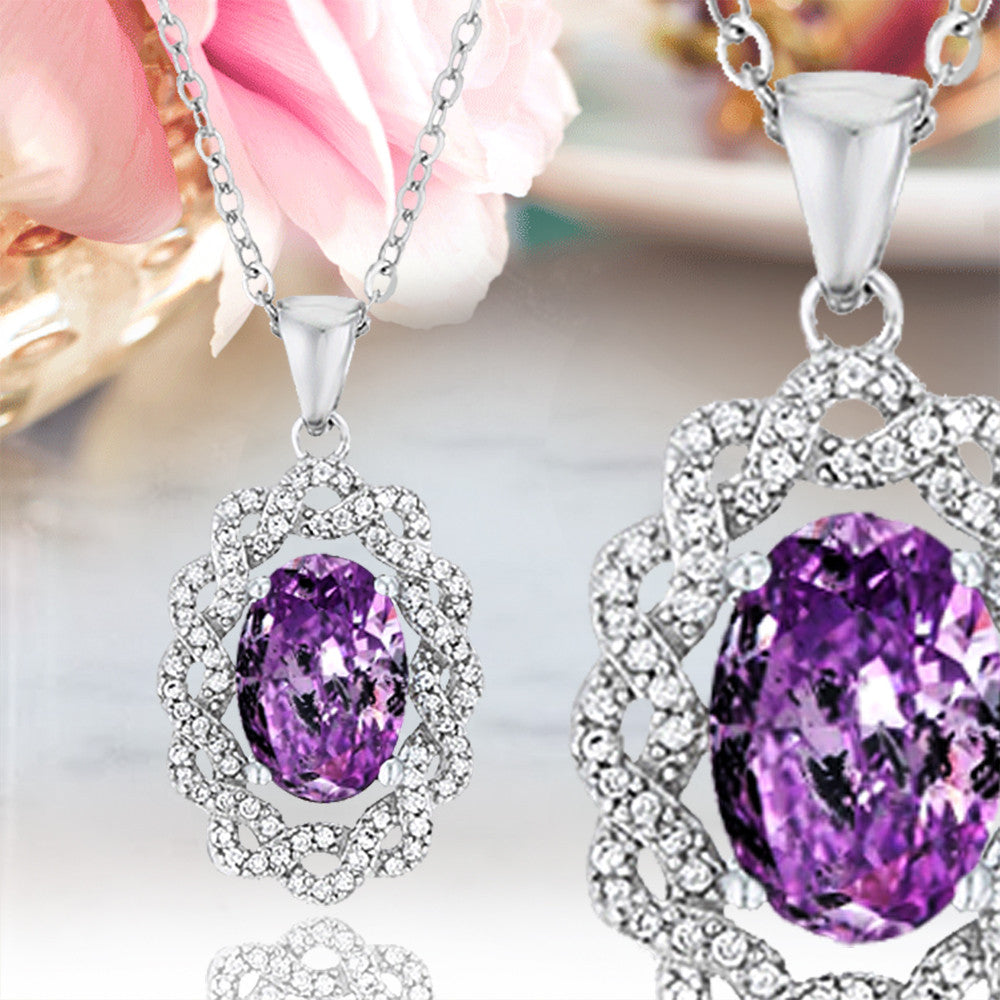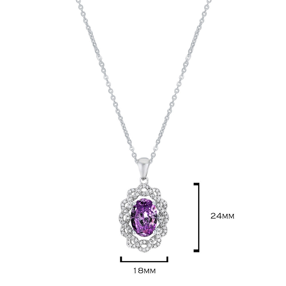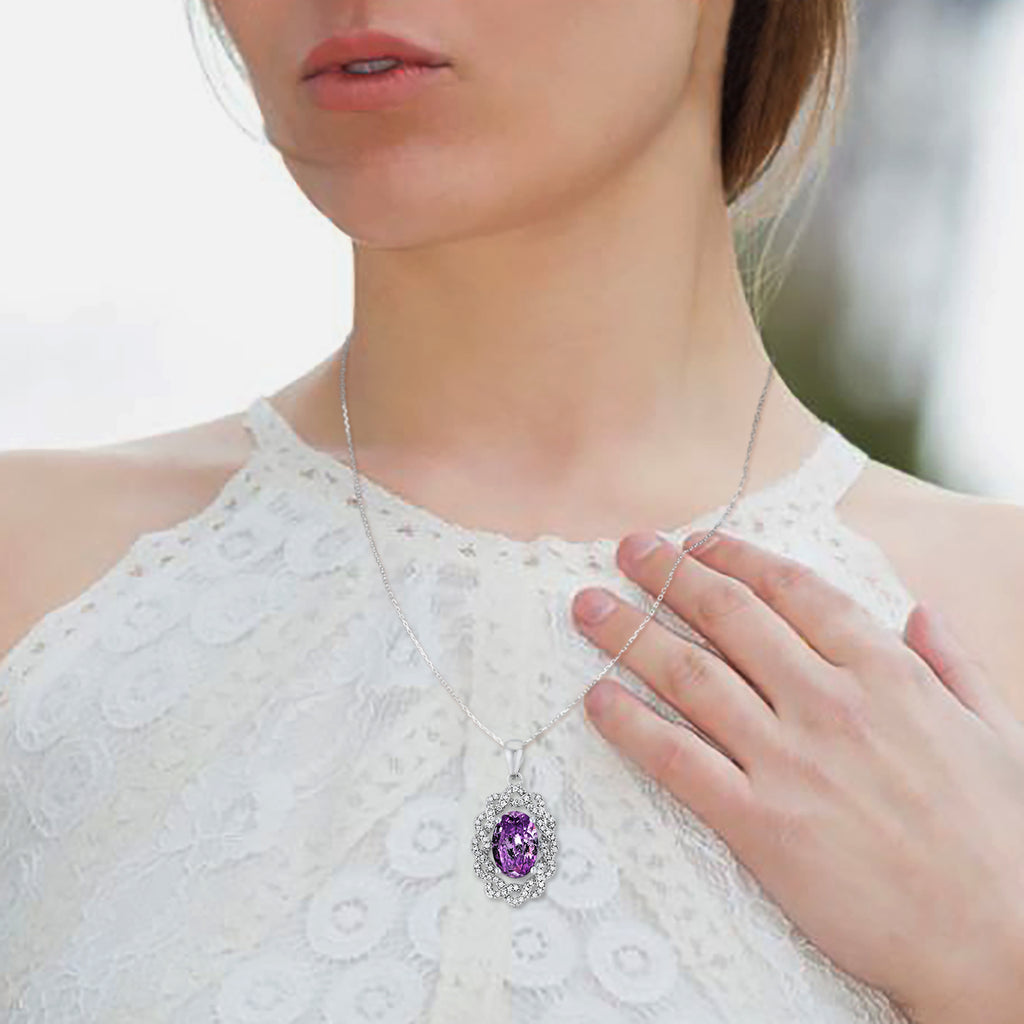 This glamorous art deco pendant sparkles with a velvety oval amethyst centerpiece, accented with colorless round cubic zirconia set in rhodium plating. On a 18"+2” chain; 5.35 total carat weight.