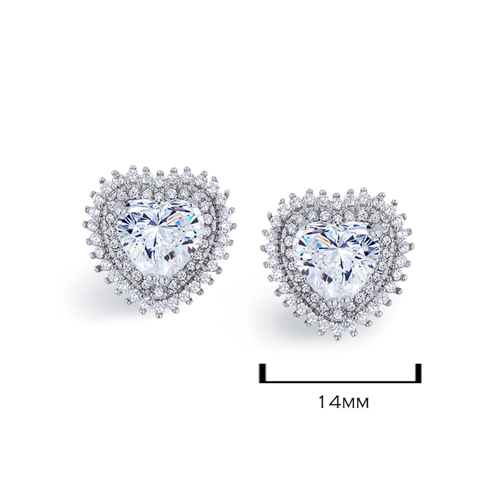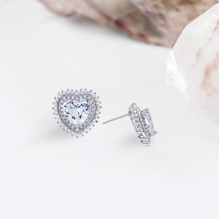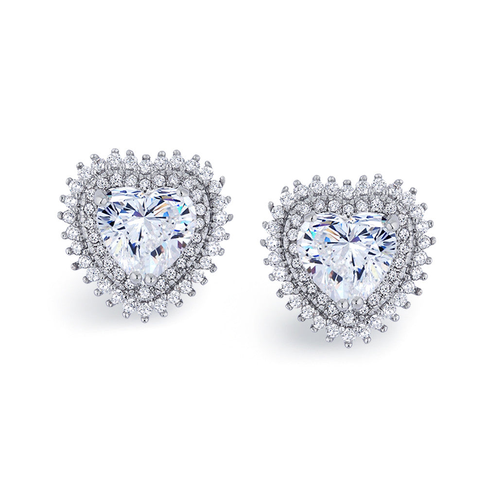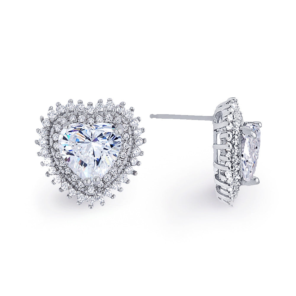 Bearing a bedazzling elegance, this set of halo cubic zirconia earrings showcases large heart-shaped center stones encircled by bead-set accents in this unique rhodium-set design.