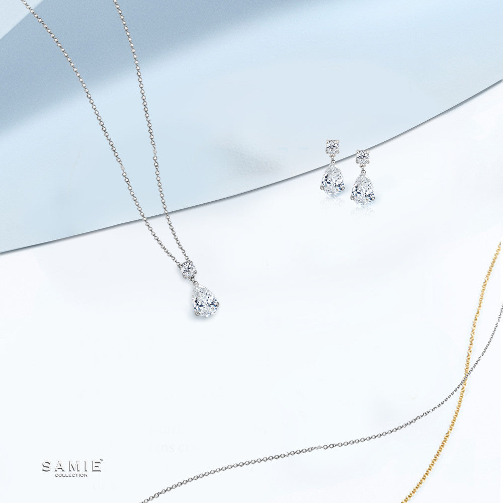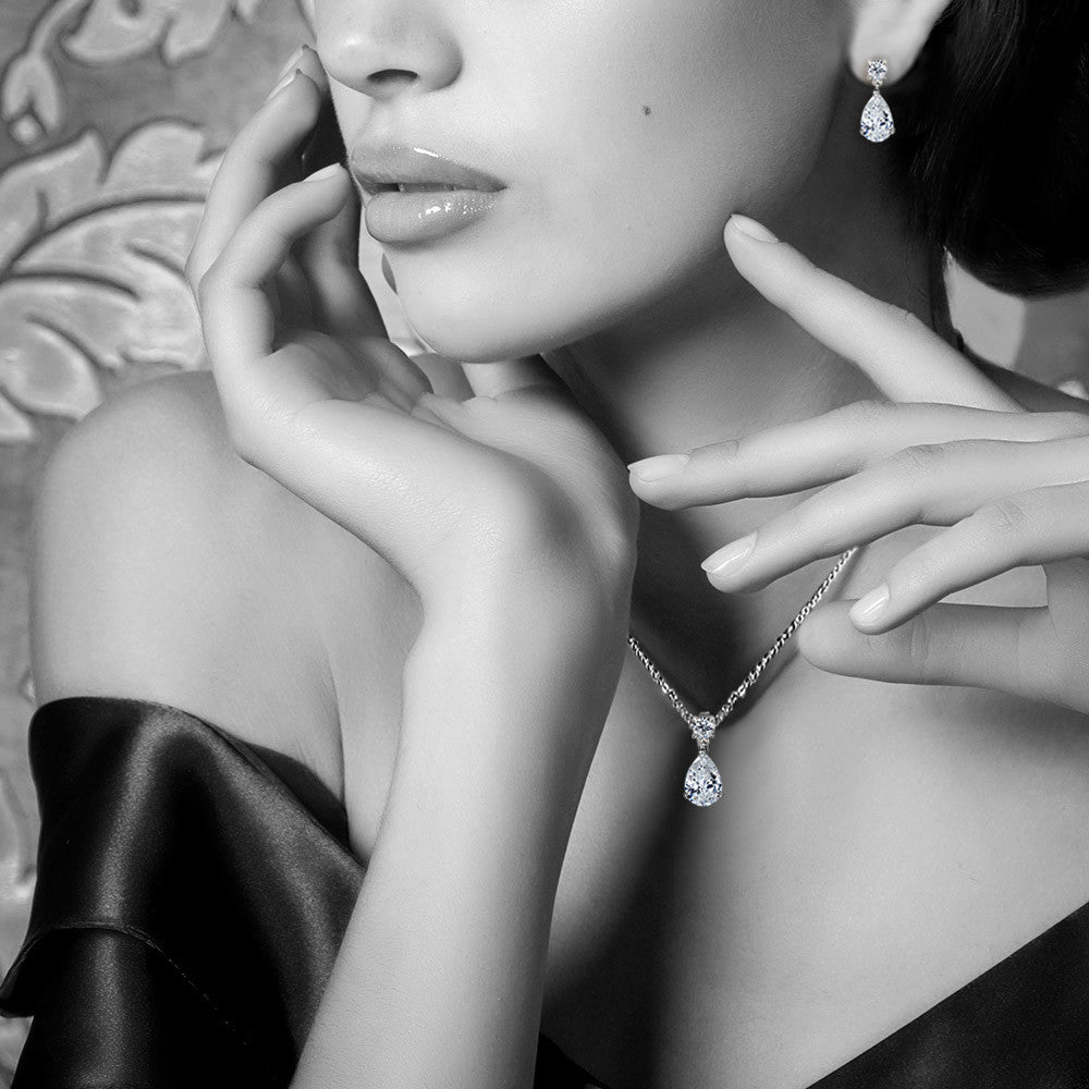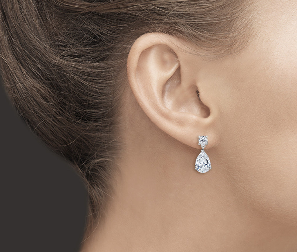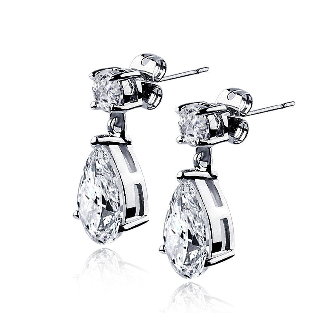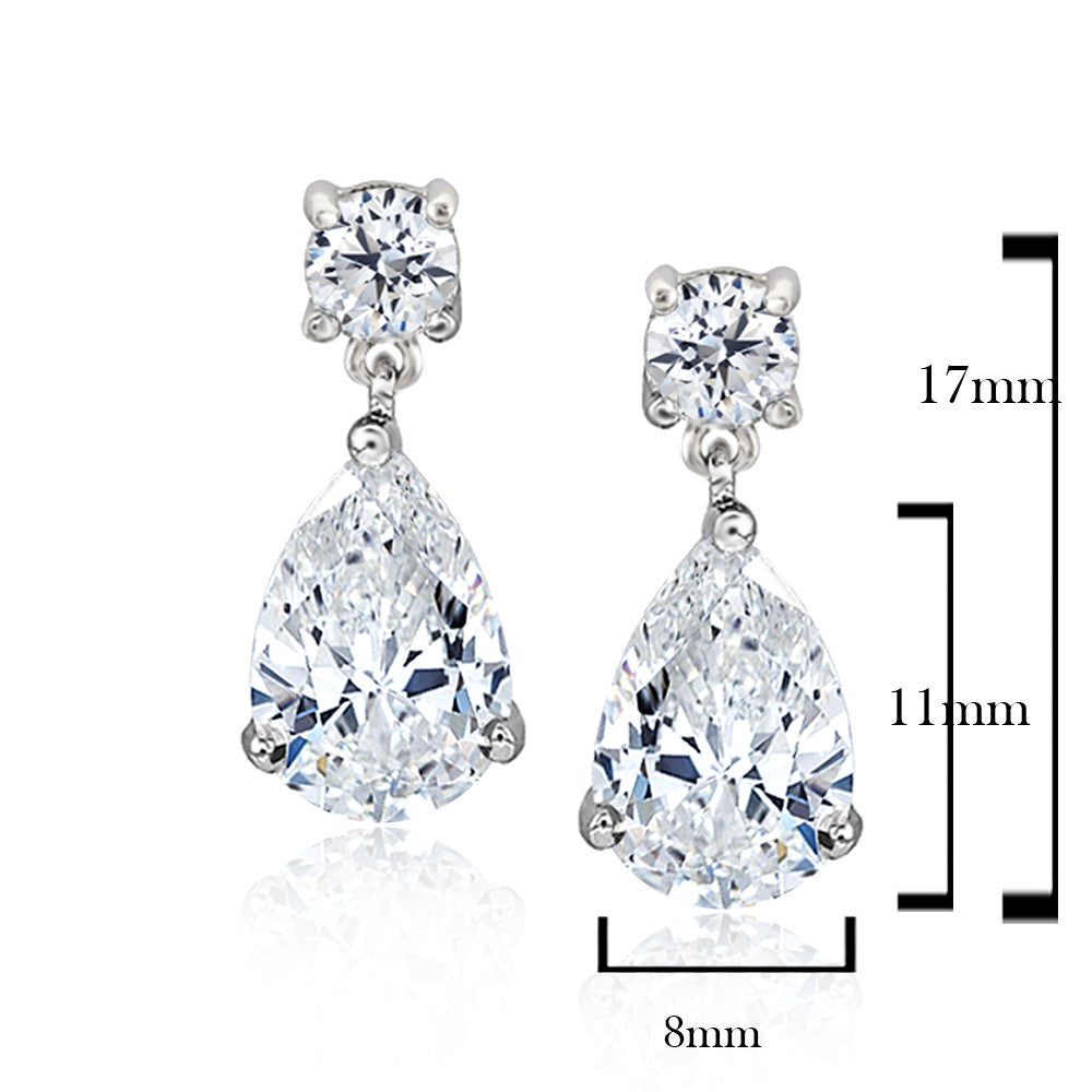 Pear-shaped and round brilliant cubic zirconia swing gracefully in the light. Earrings made with heavy layered genuine rhodium plating. Carat total weight 5.88.