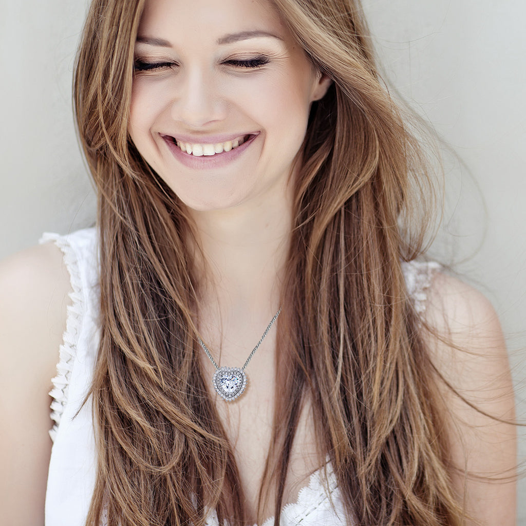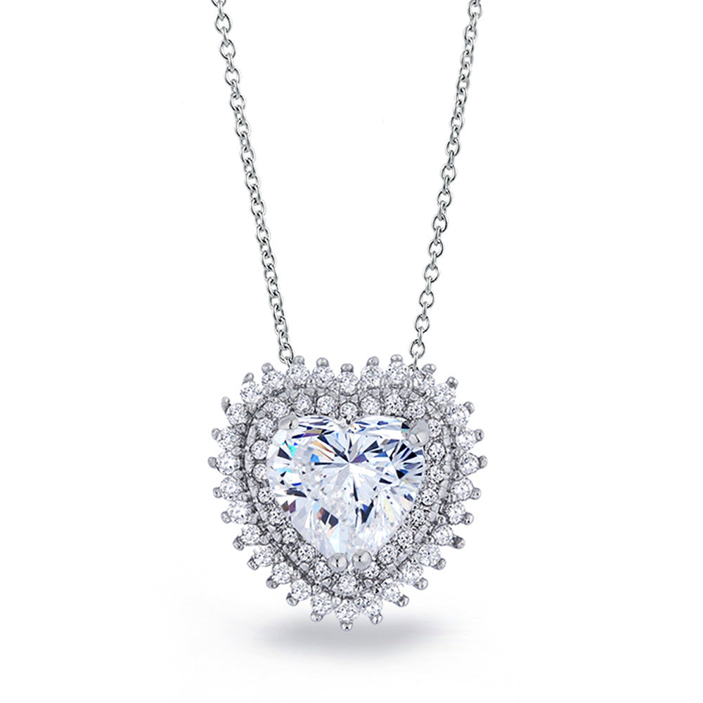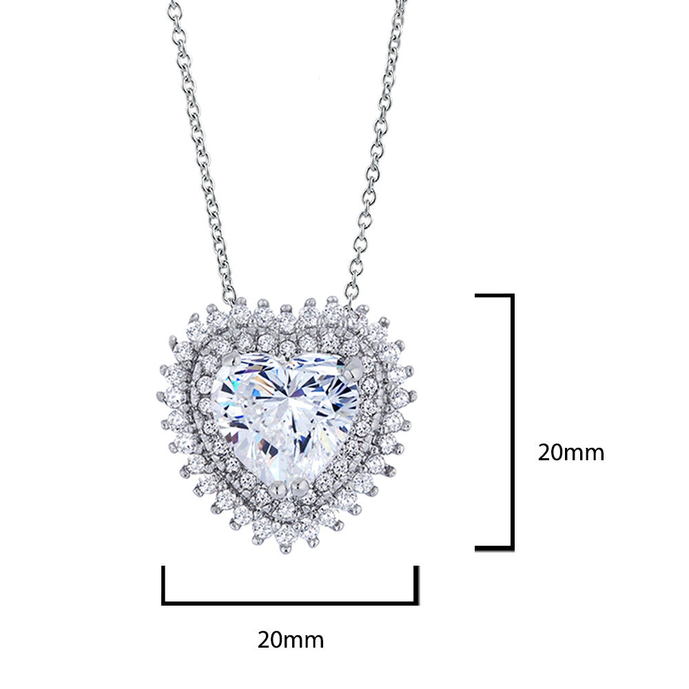 Bearing a bedazzling elegance, this set of halo cubic zirconia pendant necklace showcases large heart-shaped center stones encircled by bead-set accents in this unique rhodium-set design.