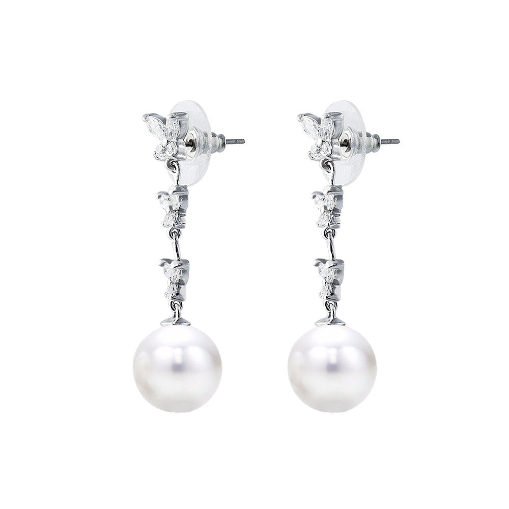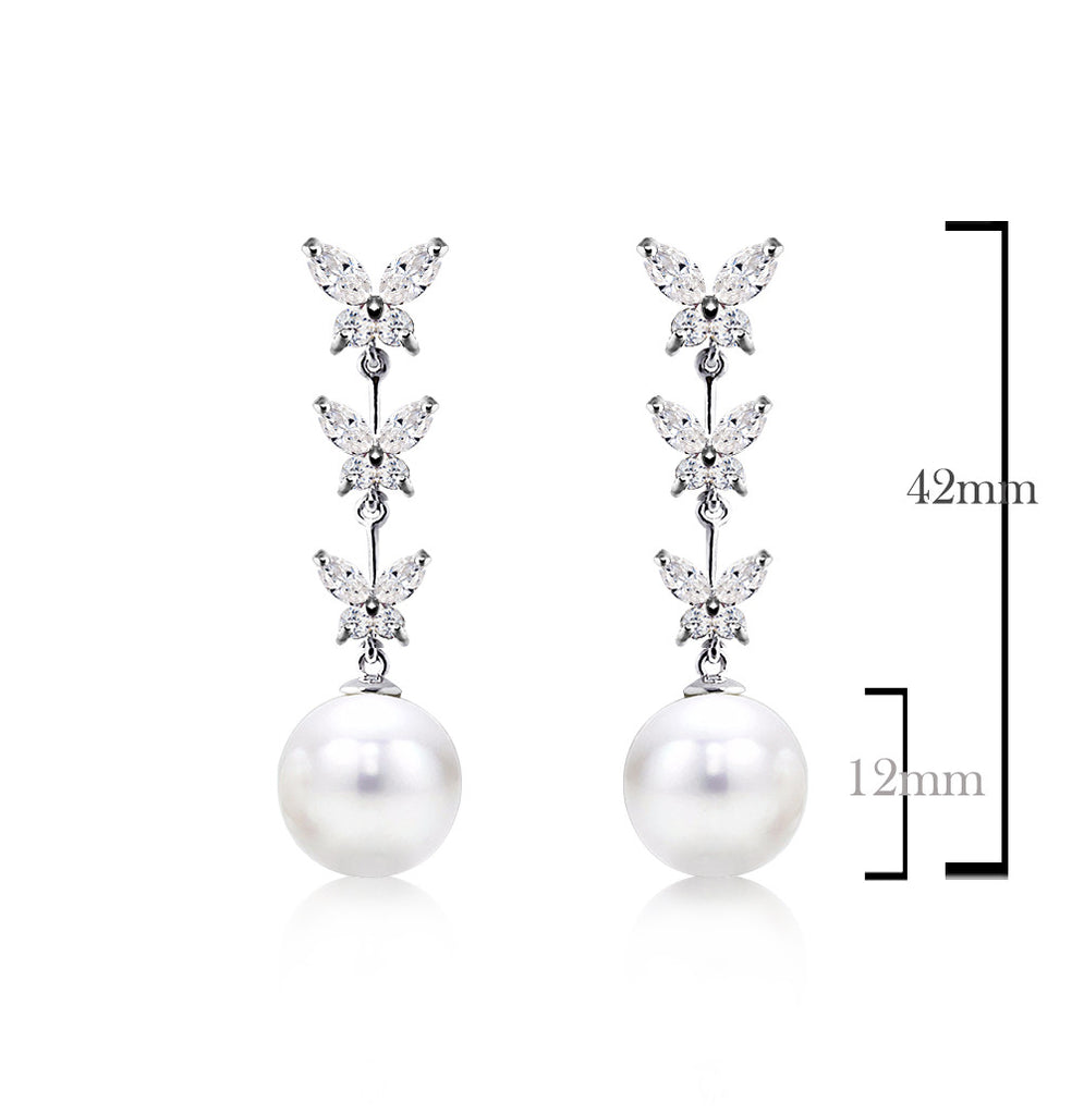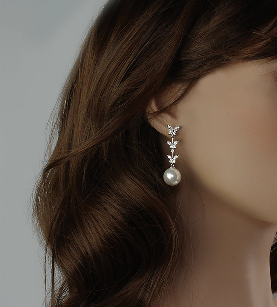 Butterfly shaped marquise-cut cubic zirconia catch the light and sparkle with shell pearls. The shell pearls elegantly complement the silvertone luster of this beautiful dangle earrings.