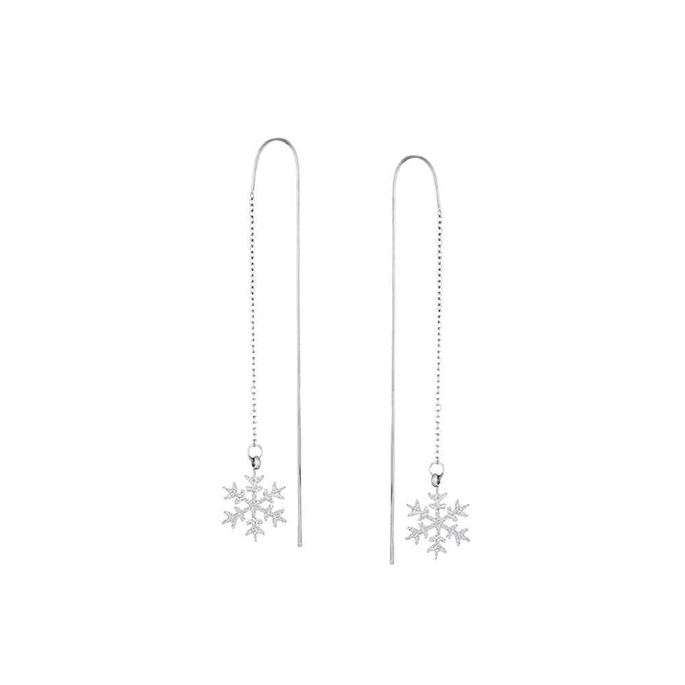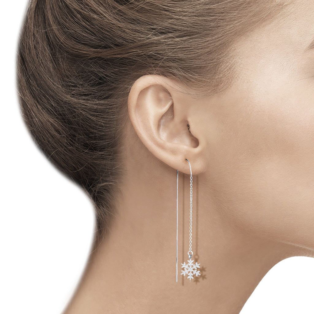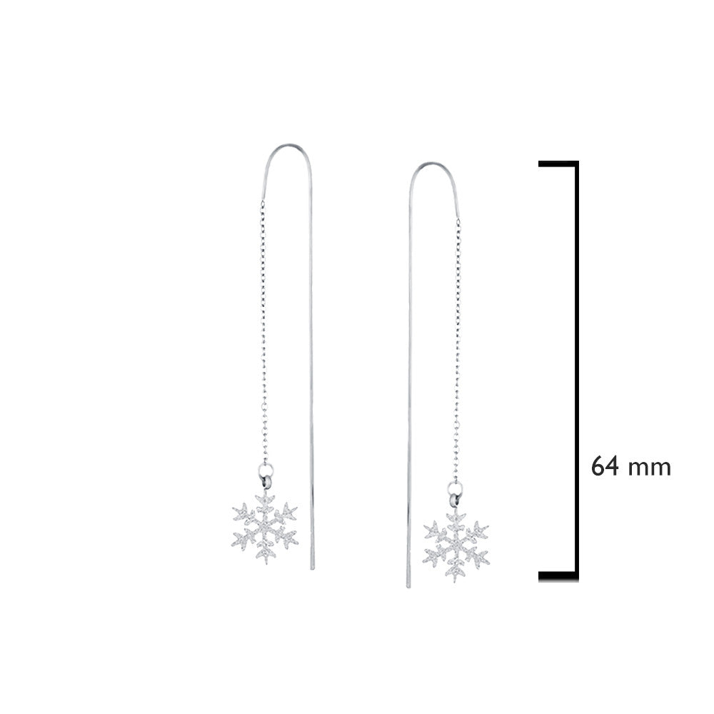 Romantic and elegant threaded dangle earrings are embellished with a snowflake motif in rhodium plating. These will certainly add a fresh touch of glamour to your outfit.