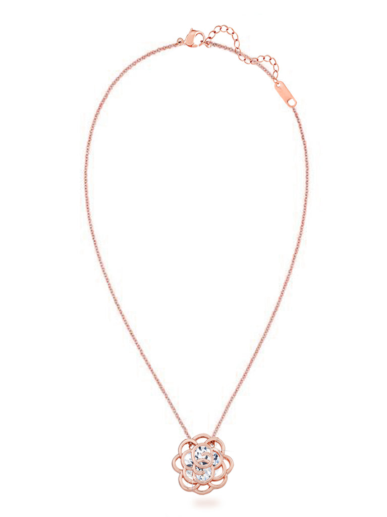 Featuring an intricate rose motif and delicate cubic zirconia accents, this pendant adds a feminine flourish on a rosegold plated chain.