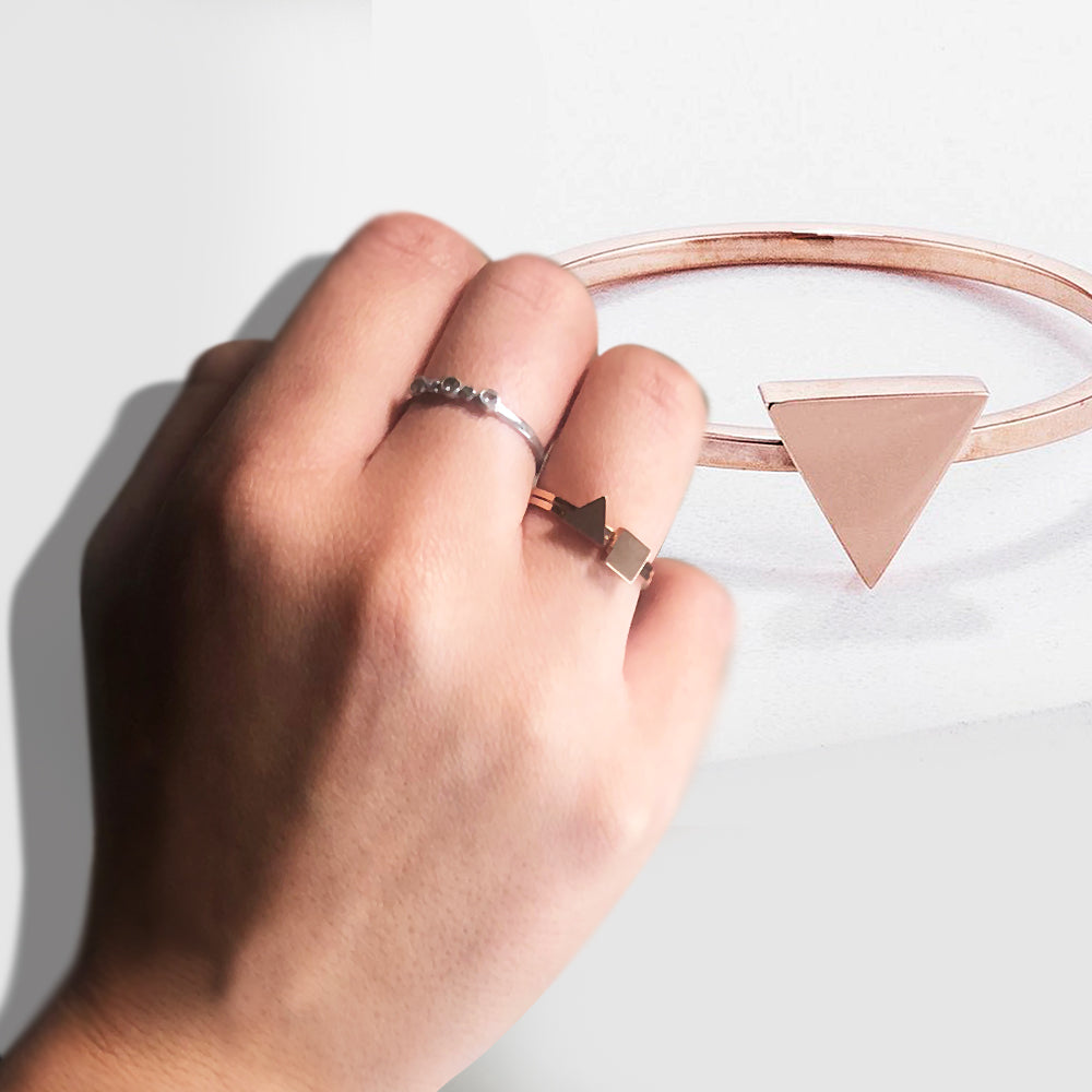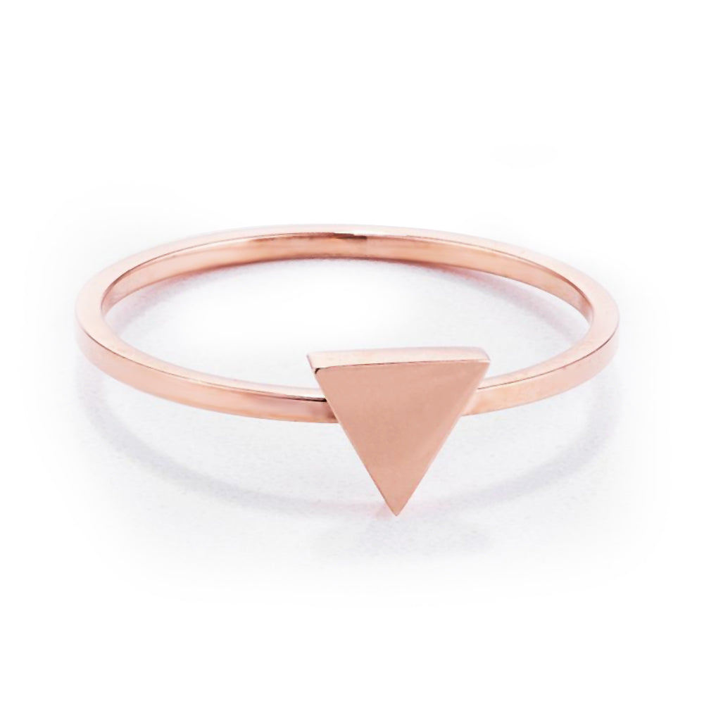 Stylishly chic, this stackable ring features a simple triangle in 18K rose gold plating. The modest design of this ring make it ideal for mixing and matching to compliment your look of the day.