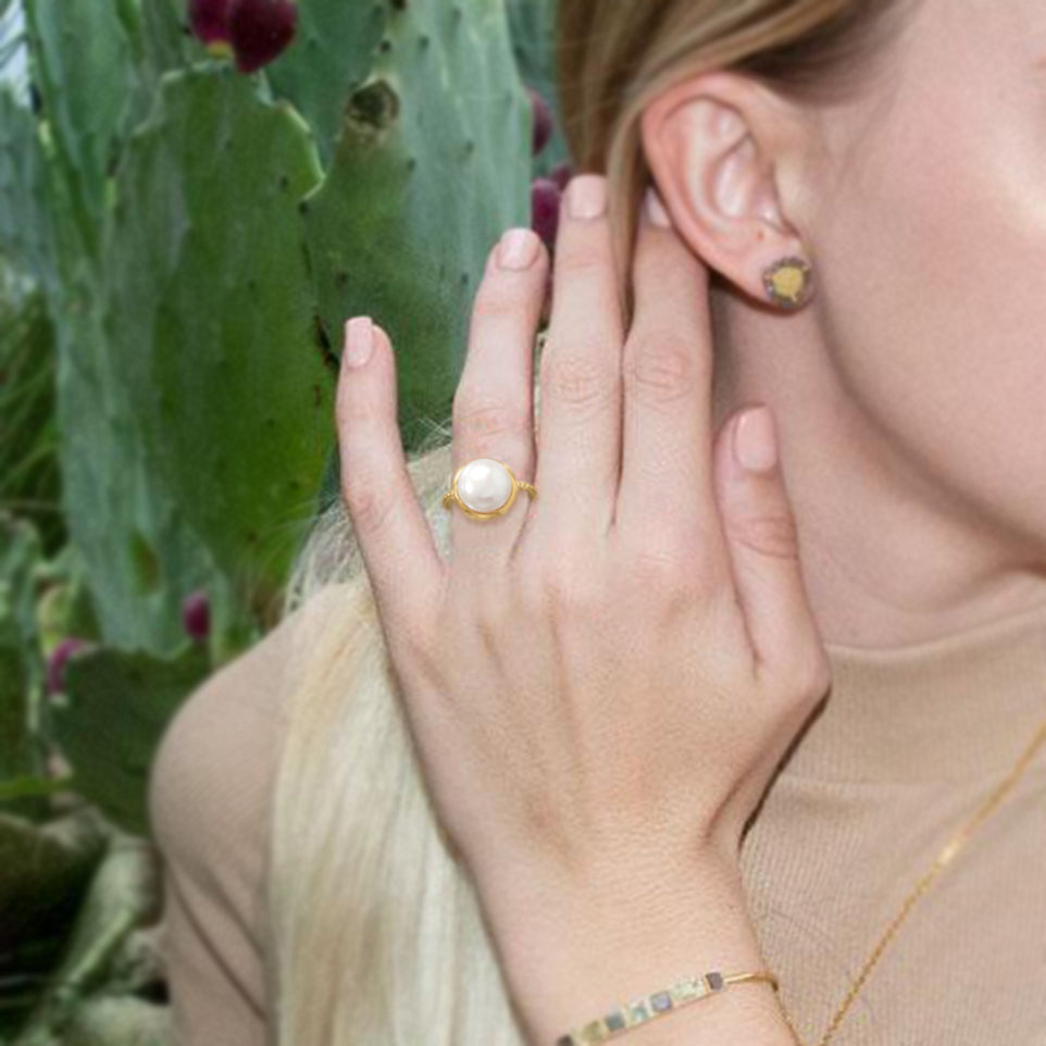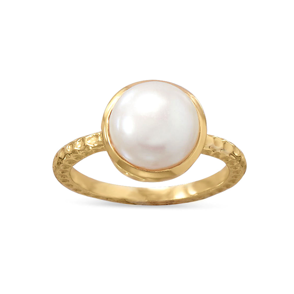 Featuring the lustrous beauty of the sea, a beautiful freshwater pearl sits on top of a textured .925 sterling silver ring with a radiant 14k gold plating finish. The simple design draws out the natural beauty of pearl, making this an exquisite gift idea.