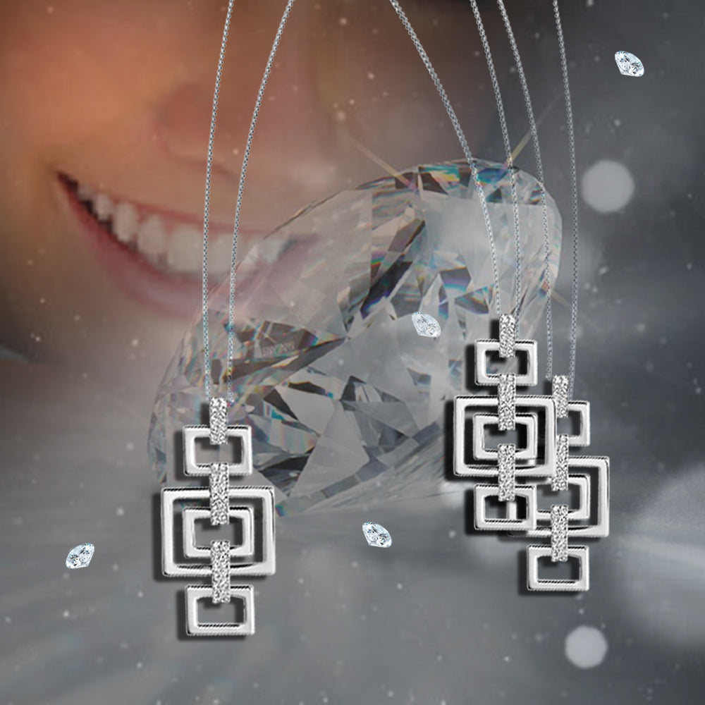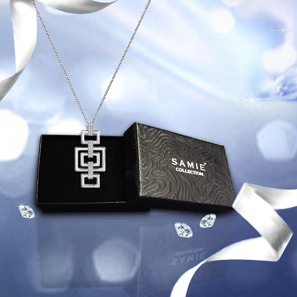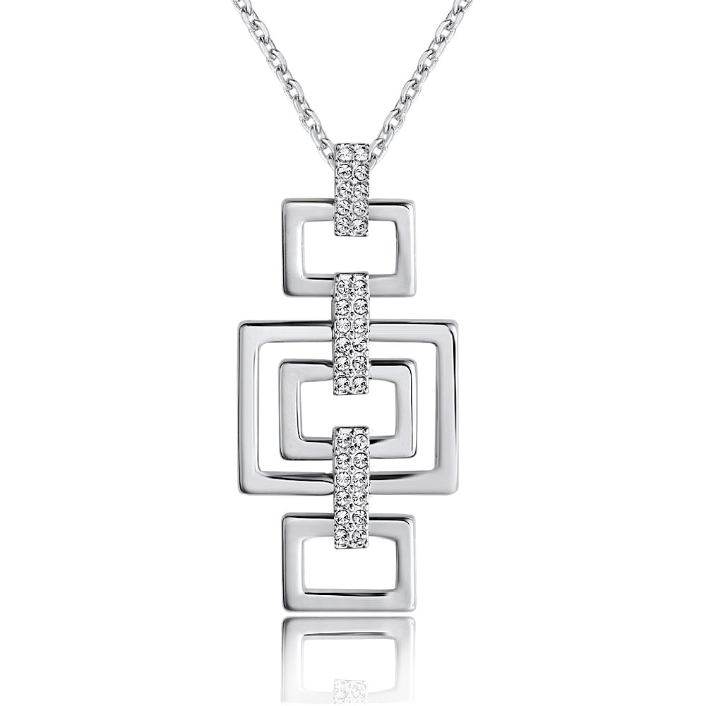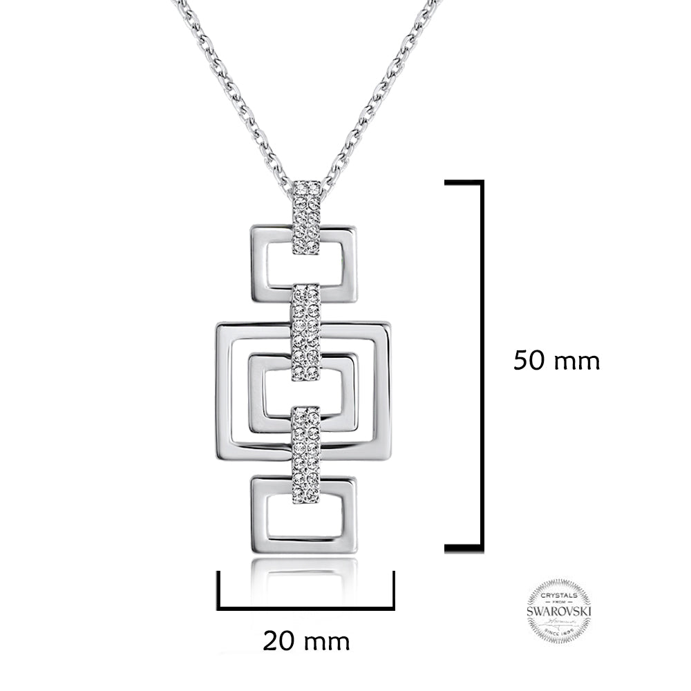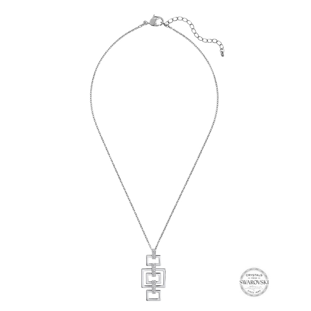 This pendant necklace features rectangles of different sizes to form a unique pattern on a chain. The pendant is accented with Swarovski crystals to complete a designer look.
