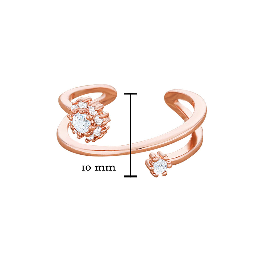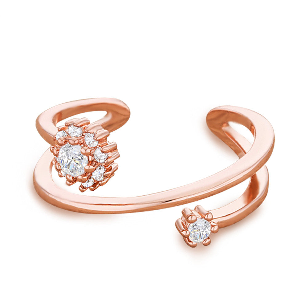This rose gold plated ring features beautiful swirls with two prong-set cubic zirconia that seems to float magically between the fingers. Perfect for stacking and easy to mix and match.