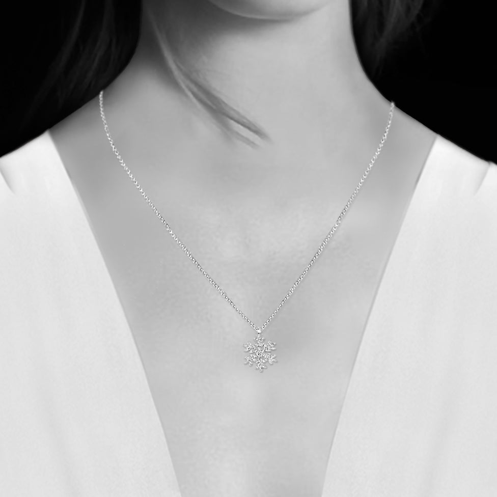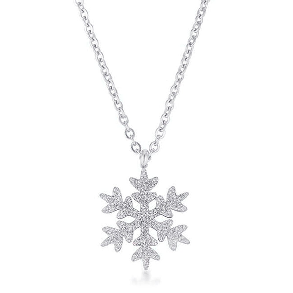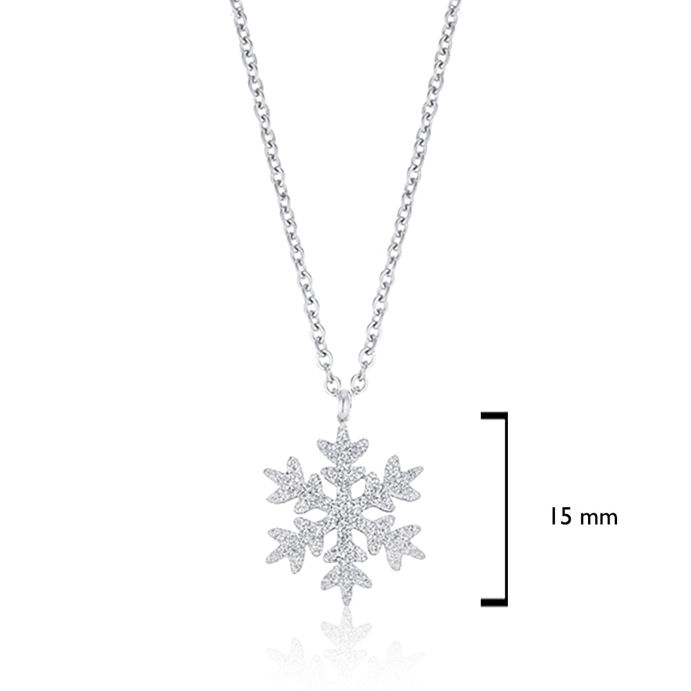 This snowflake necklace speaks through purity and gentleness, representing its dual quality dropping from heaven and blanketing the earth in a calm embrace. Pendant is textured in rhodium plating on an 18 inch stainless steel chain.